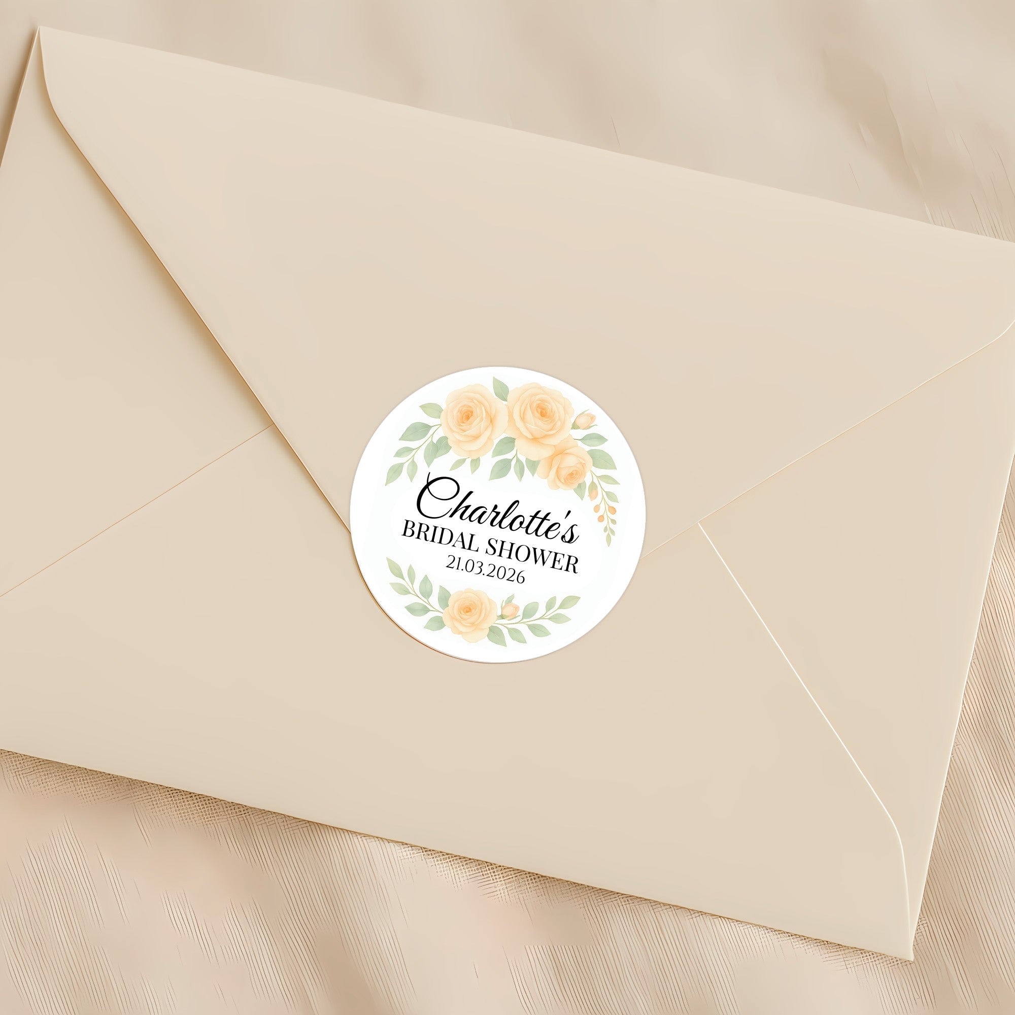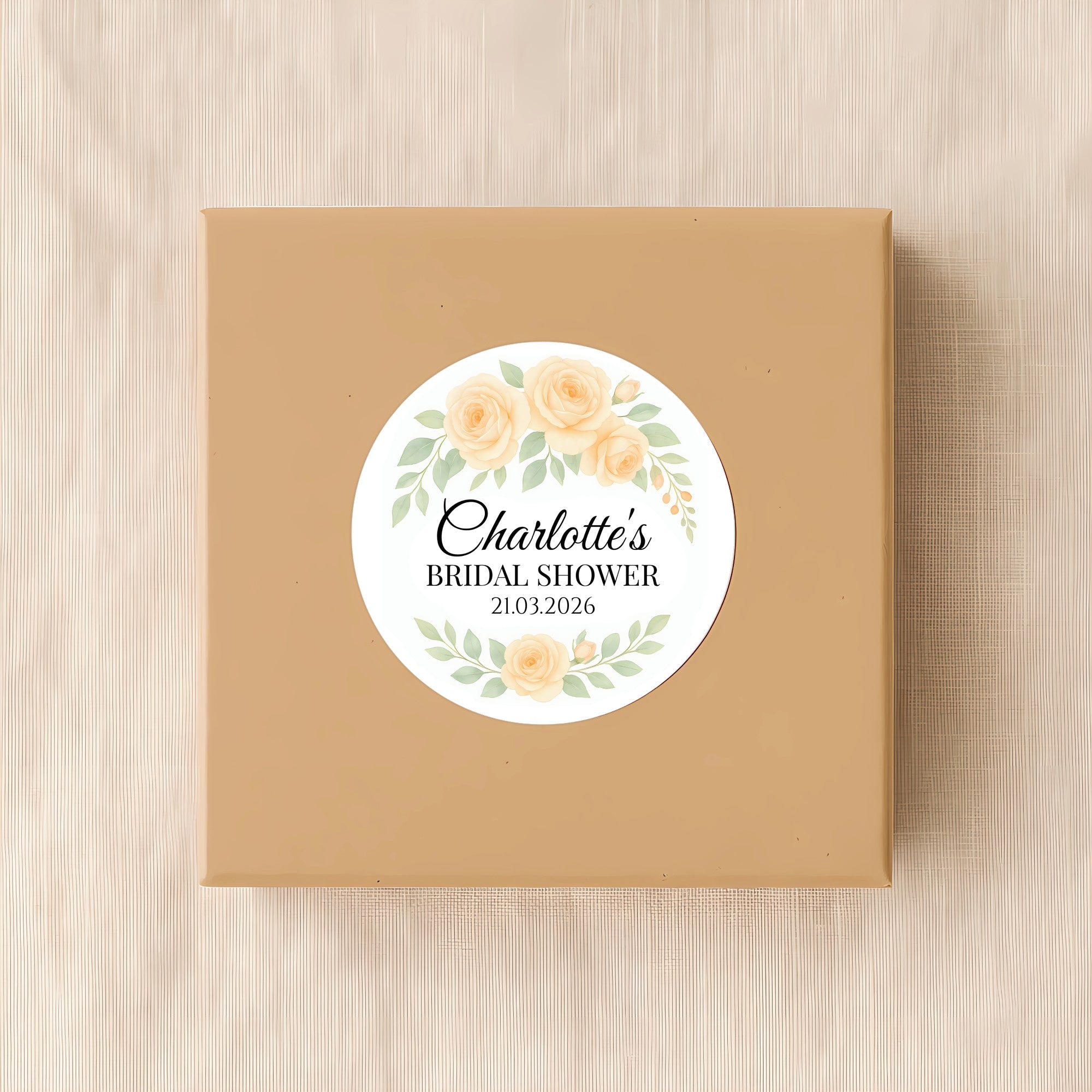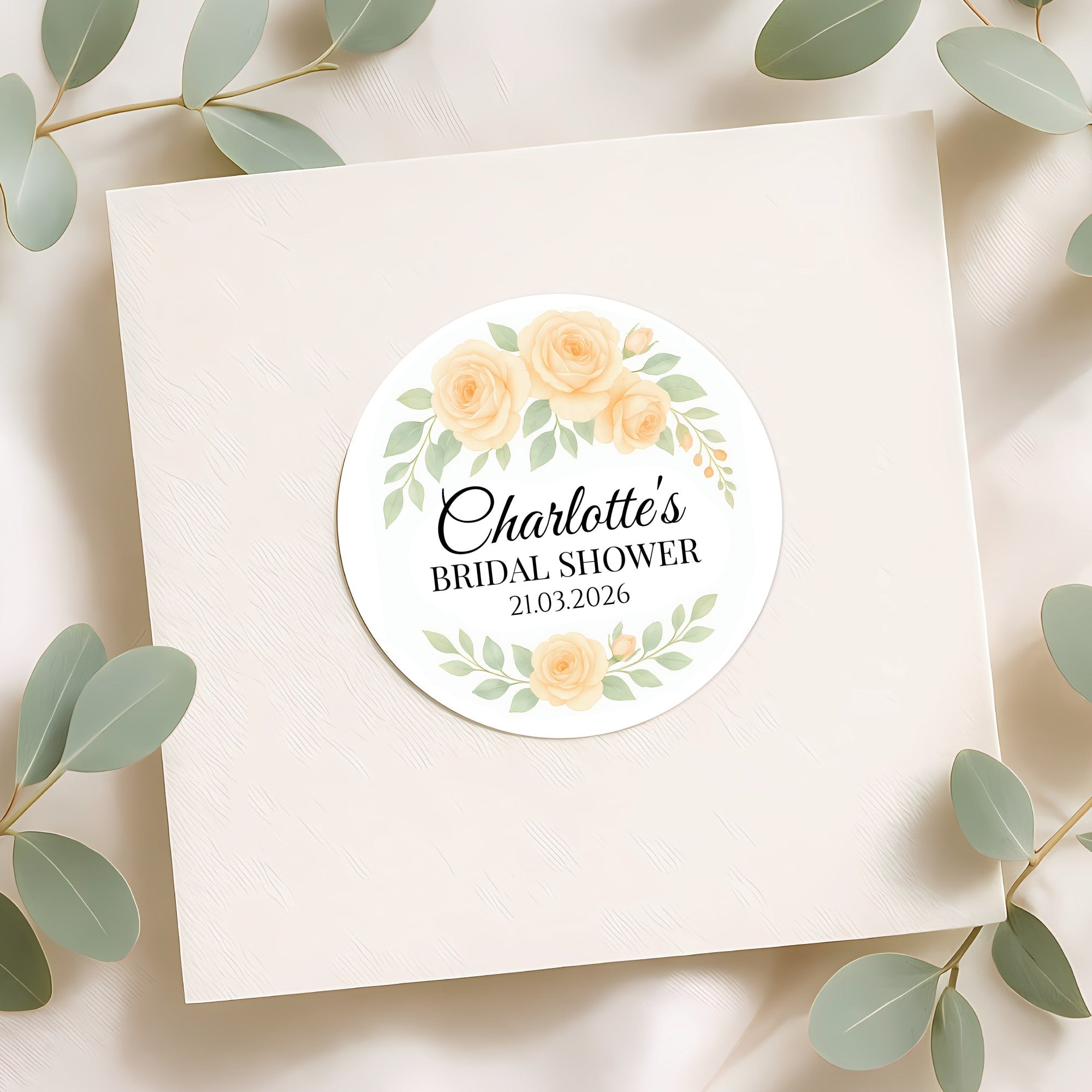 Add a soft, elegant touch to your bridal shower favours with these personalised apricot rose stickers. Featuring gentle peach-toned roses with muted sage greenery in a delicate watercolour style, this design creates a warm, romantic and timeless look for your celebration.