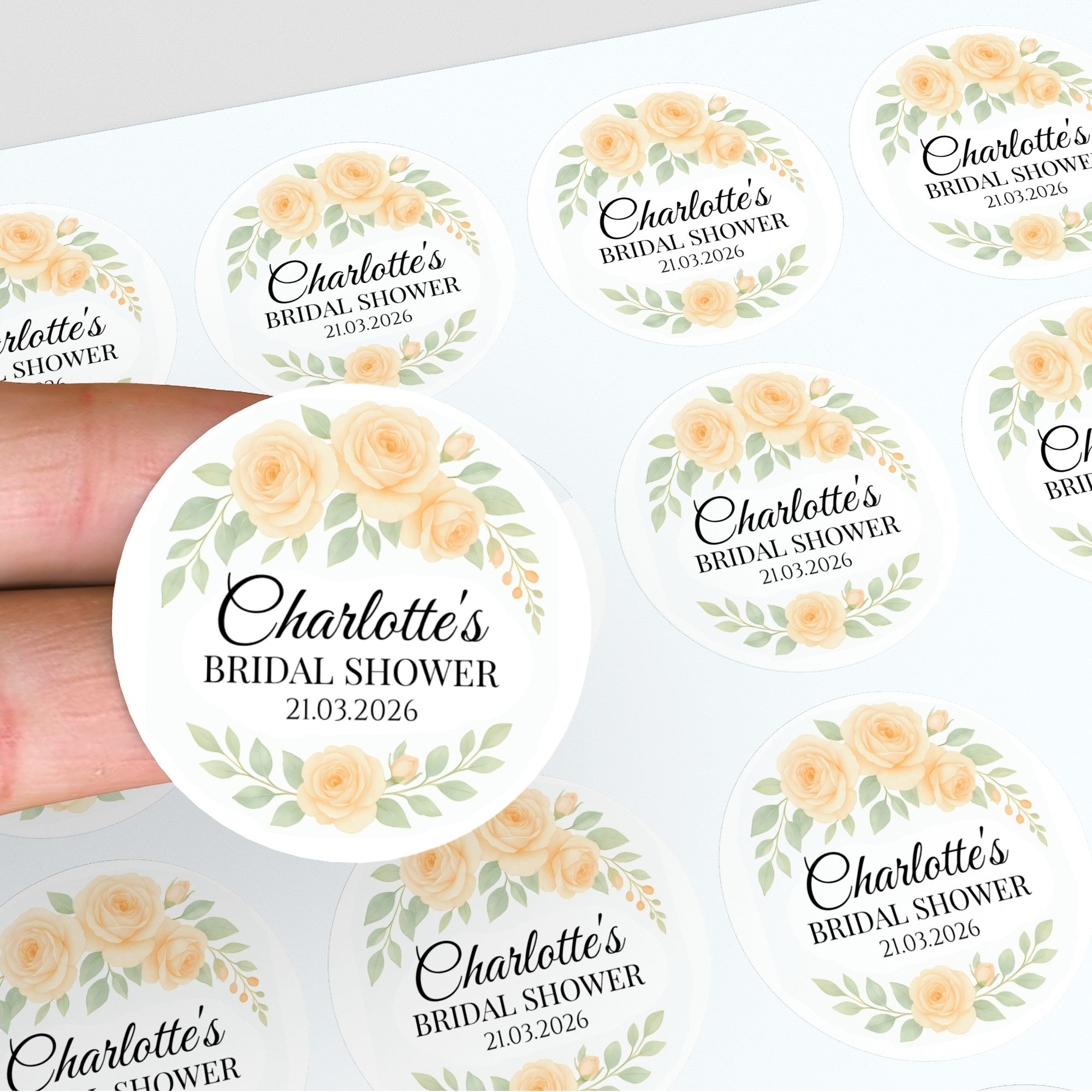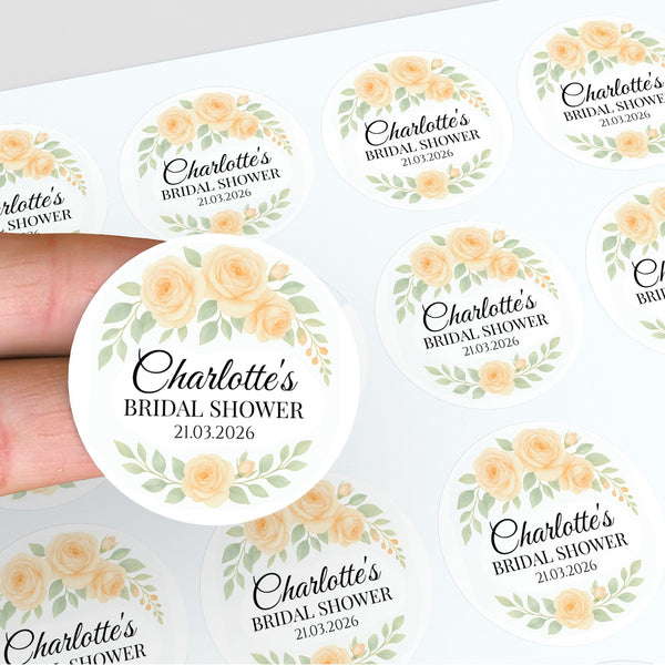 Personalised Apricot Rose Bridal Shower Stickers – Custom Name & Date Favour Labels – Peach Watercolour Floral Stickers