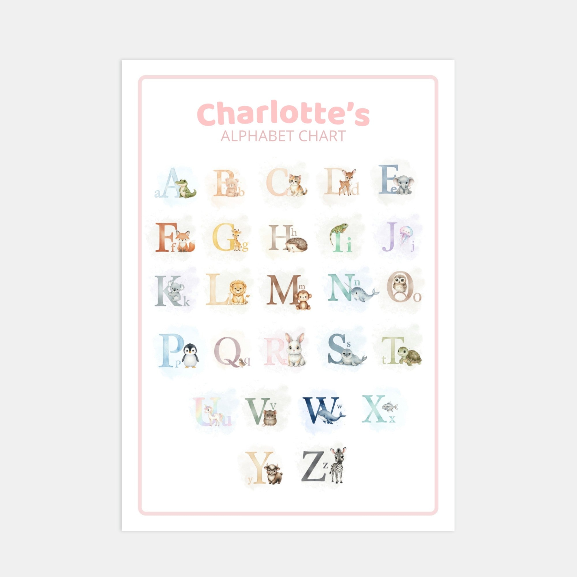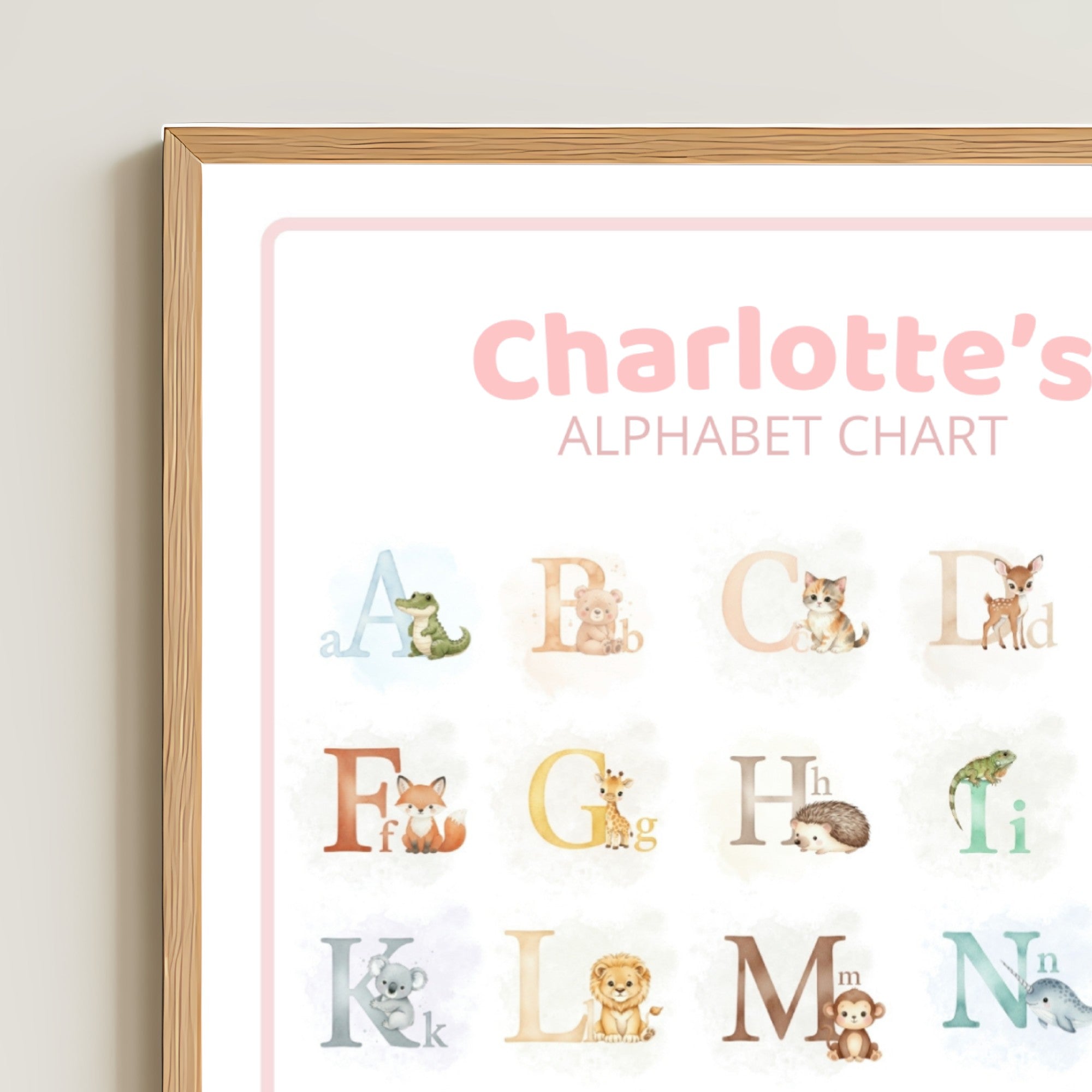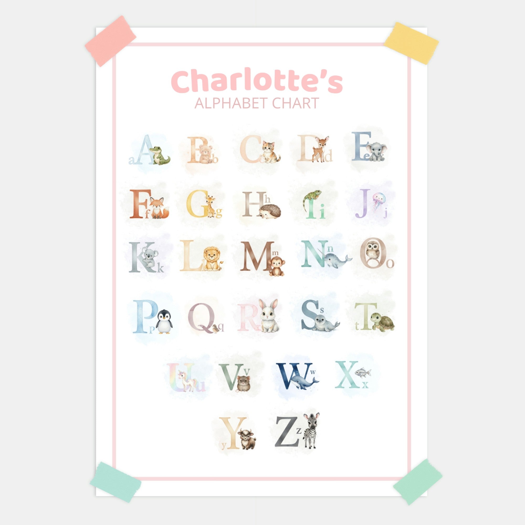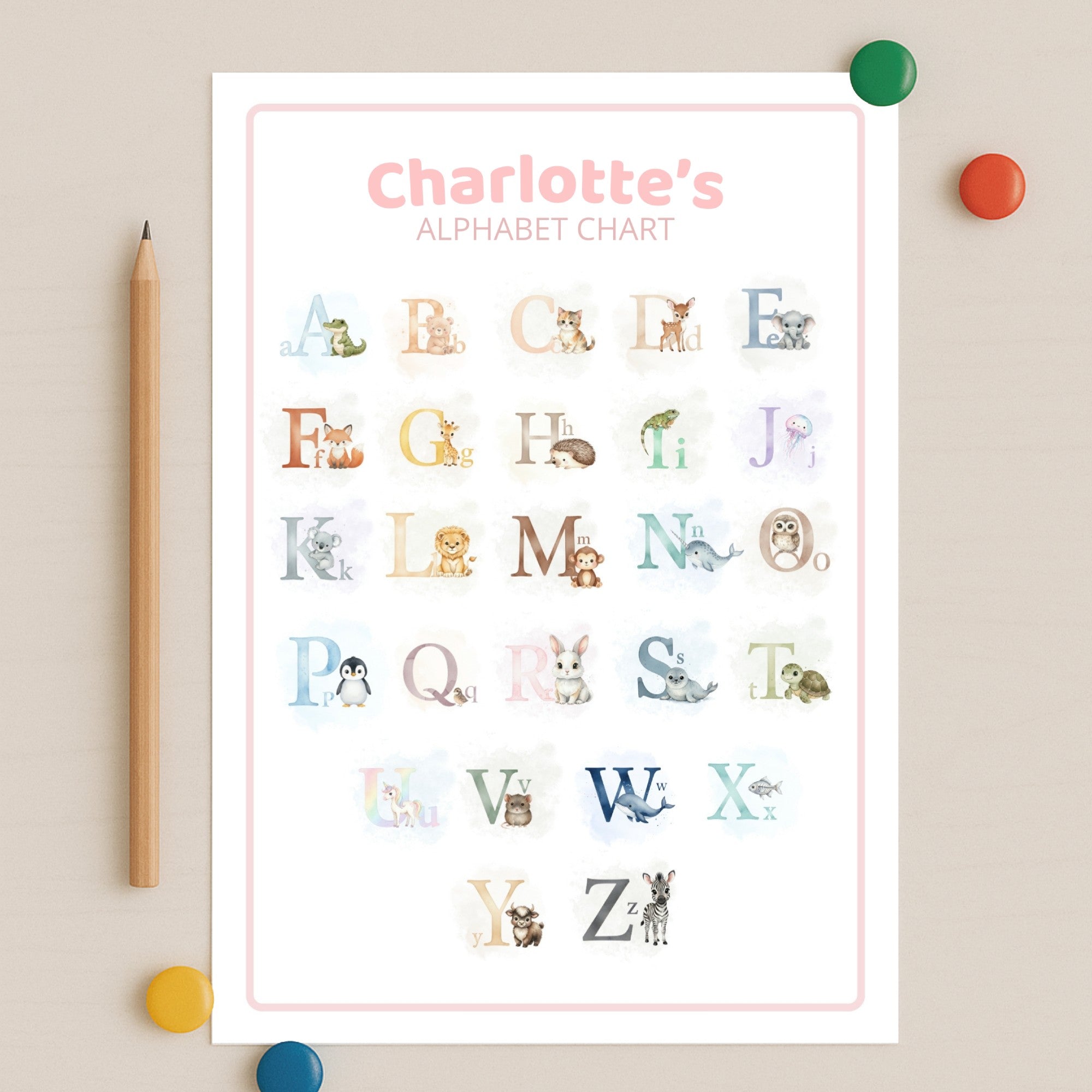 Personalised Baby Alphabet Chart – Soft Watercolour Nursery Print | A–Z Animal Wall Art | A4, A3 & US Letter Sizes