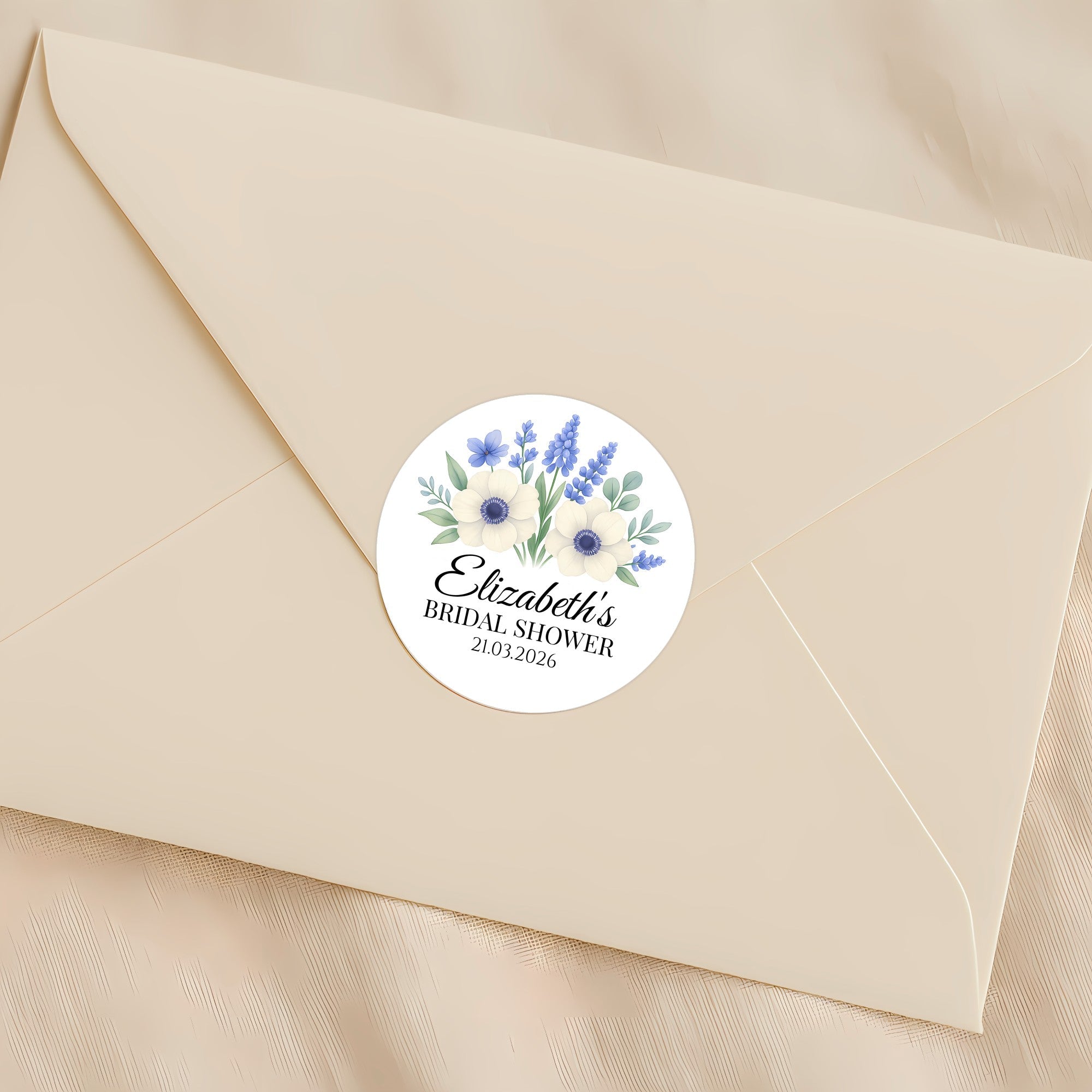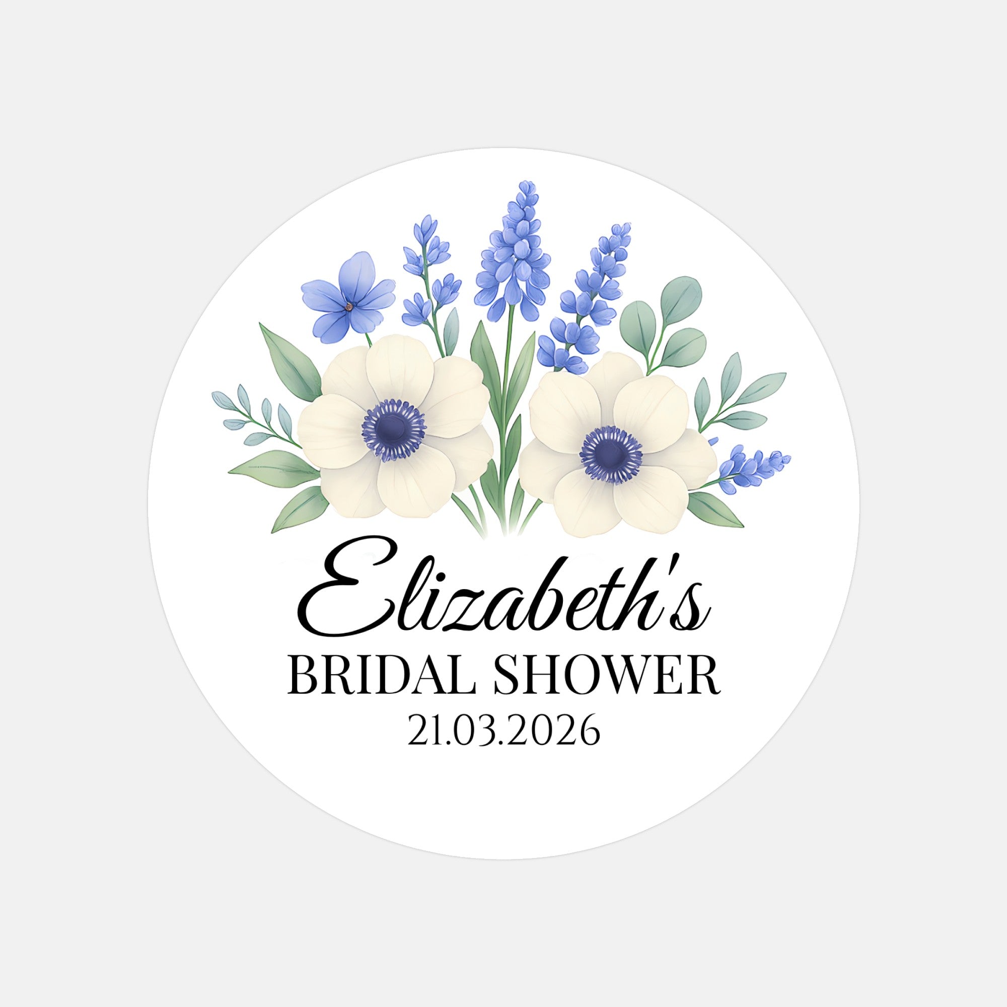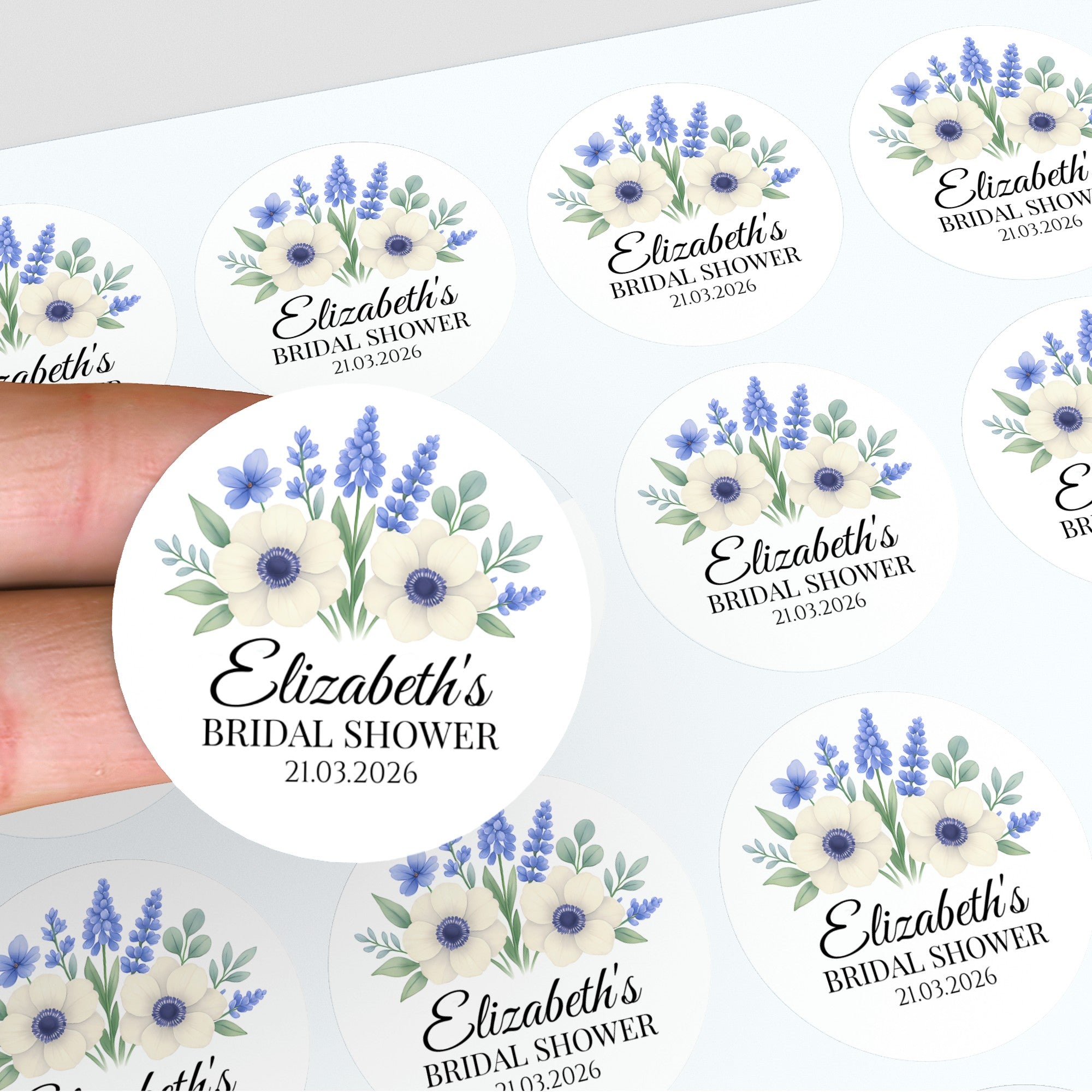 Personalised Blue Anemone Bridal Shower Stickers – Custom Name & Date – Watercolour Floral Favour Labels