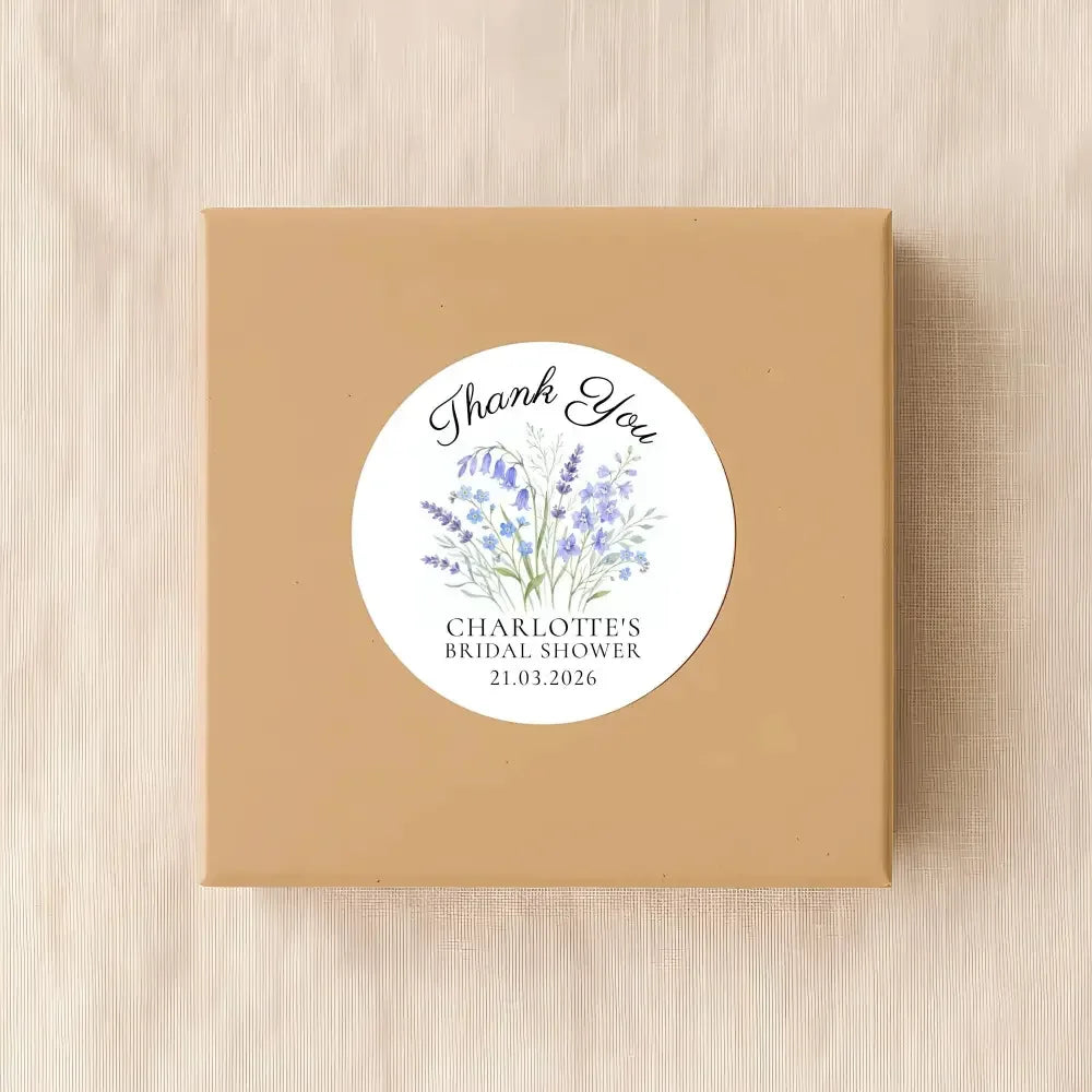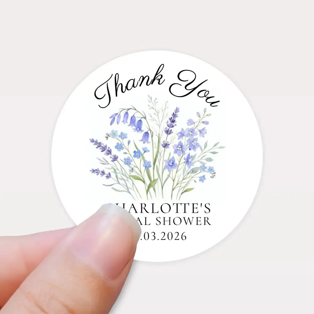 Personalised Blue Wildflower Bridal Shower Thank You Stickers – Custom Name & Date – Watercolour Floral Favour Labels