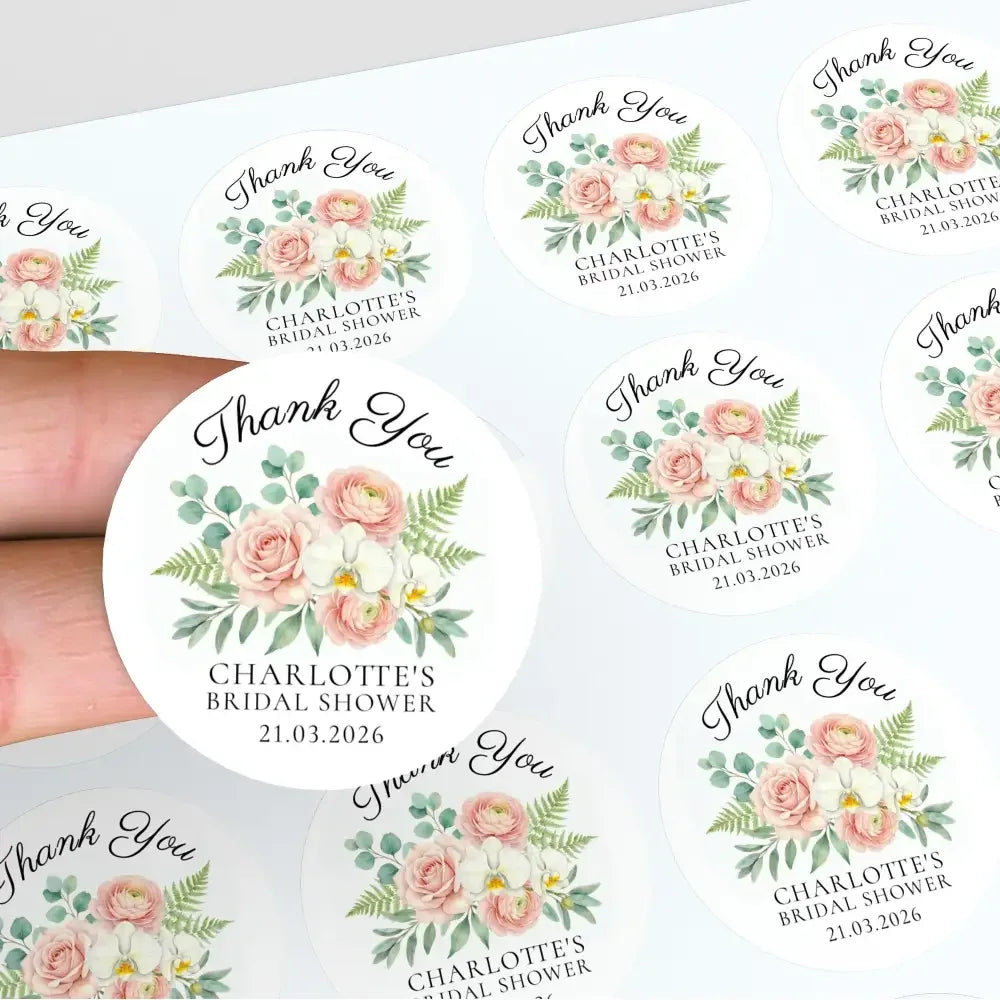 Personalised Blush Floral Bridal Shower Thank You Stickers – Custom Name & Date – Watercolour Peony & Orchid Labels