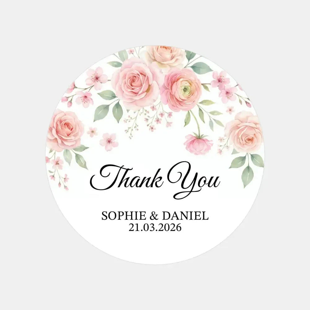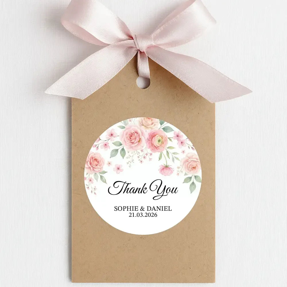 Personalised Blush Pink Floral Wedding Thank You Stickers | Rose & Blossom Favour Labels