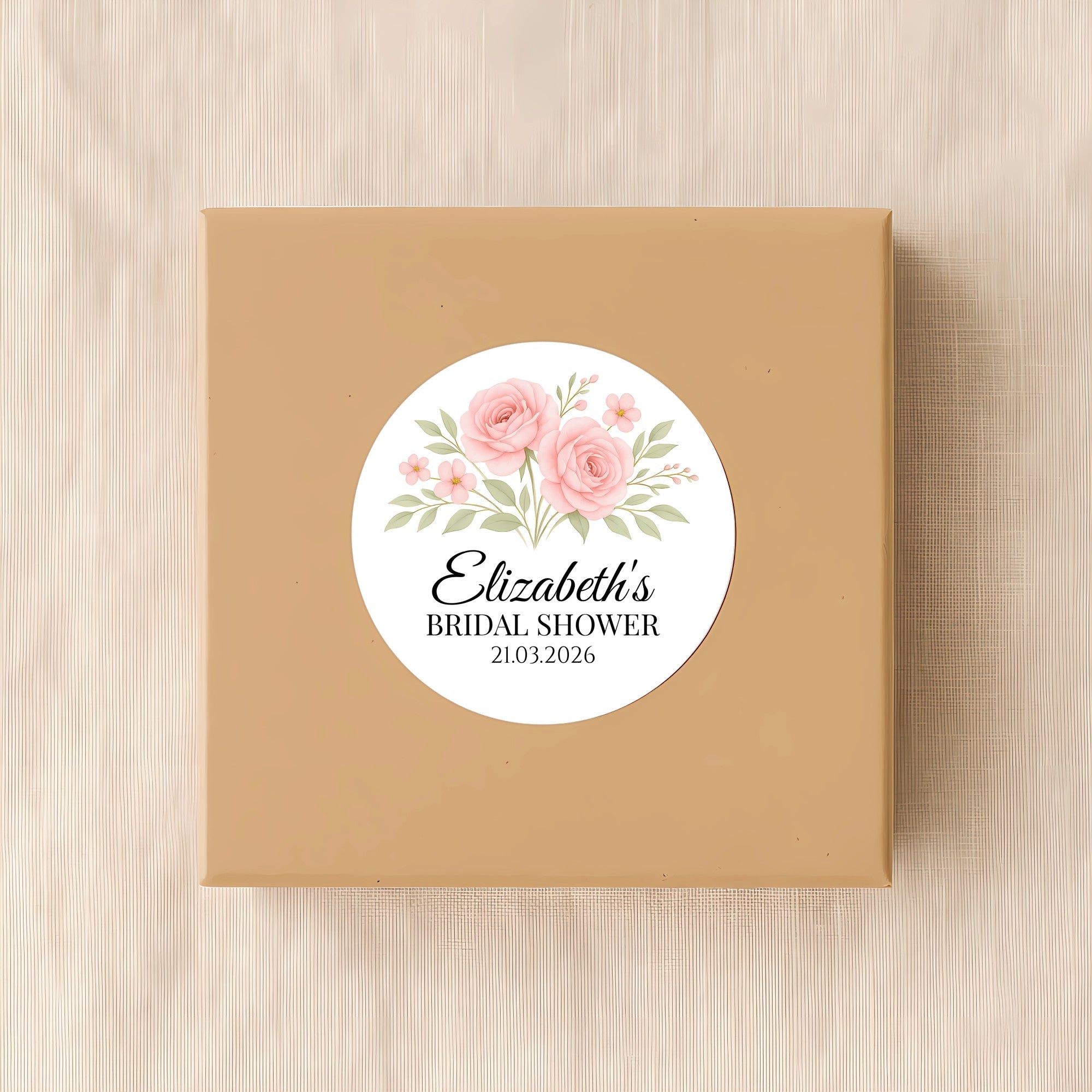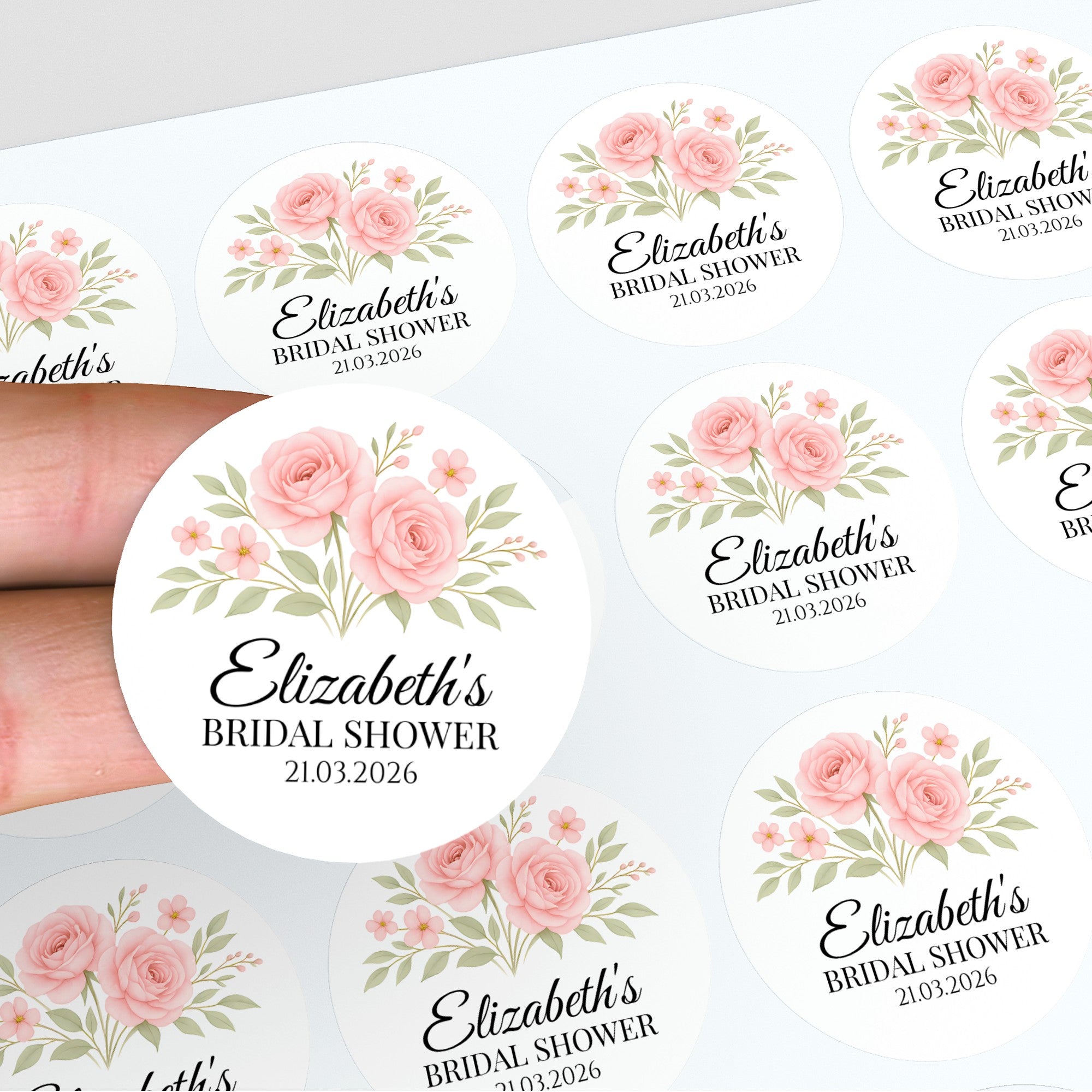 Personalised Blush Rose Bridal Shower Stickers – Custom Name & Date – Watercolour Floral Favour Labels