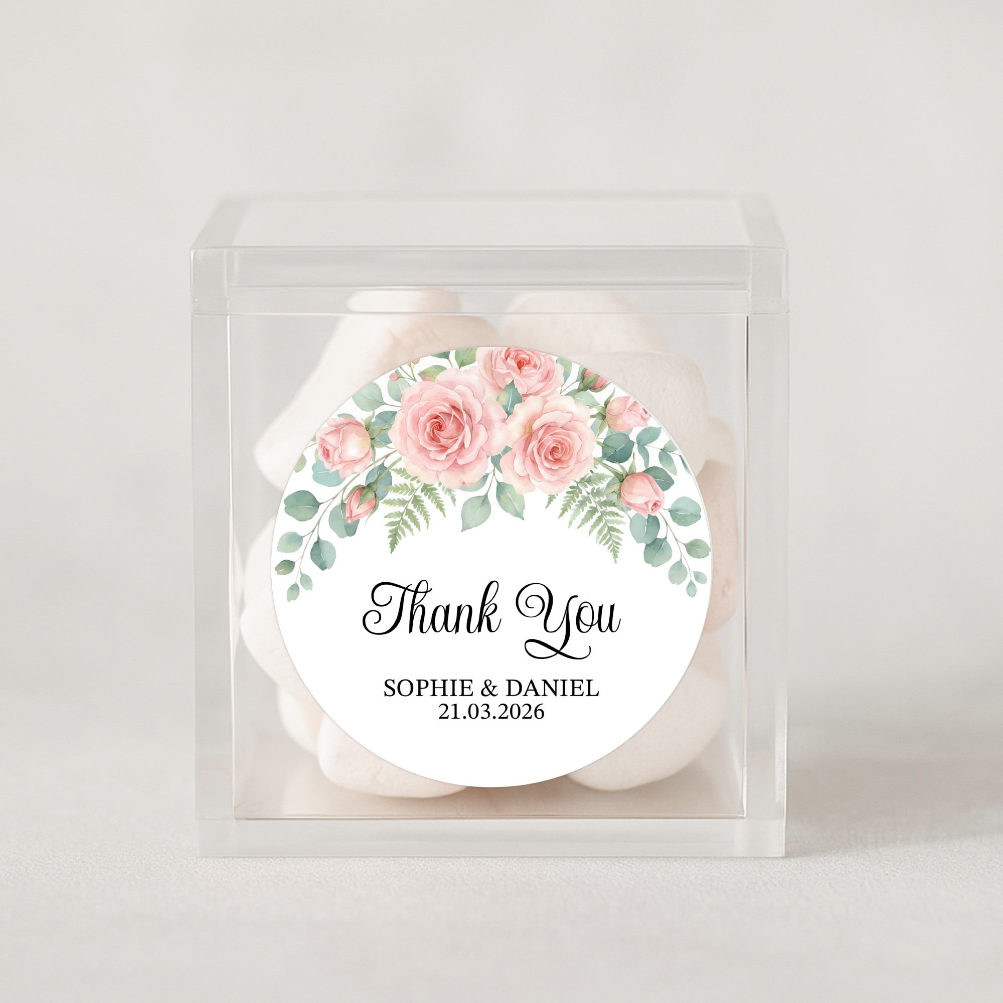Add a soft, romantic touch to your wedding favours with these personalised blush rose Thank You stickers. Featuring hand-painted pink garden roses paired with delicate eucalyptus leaves and fern details, this design brings an elegant, timeless feel to your special day.