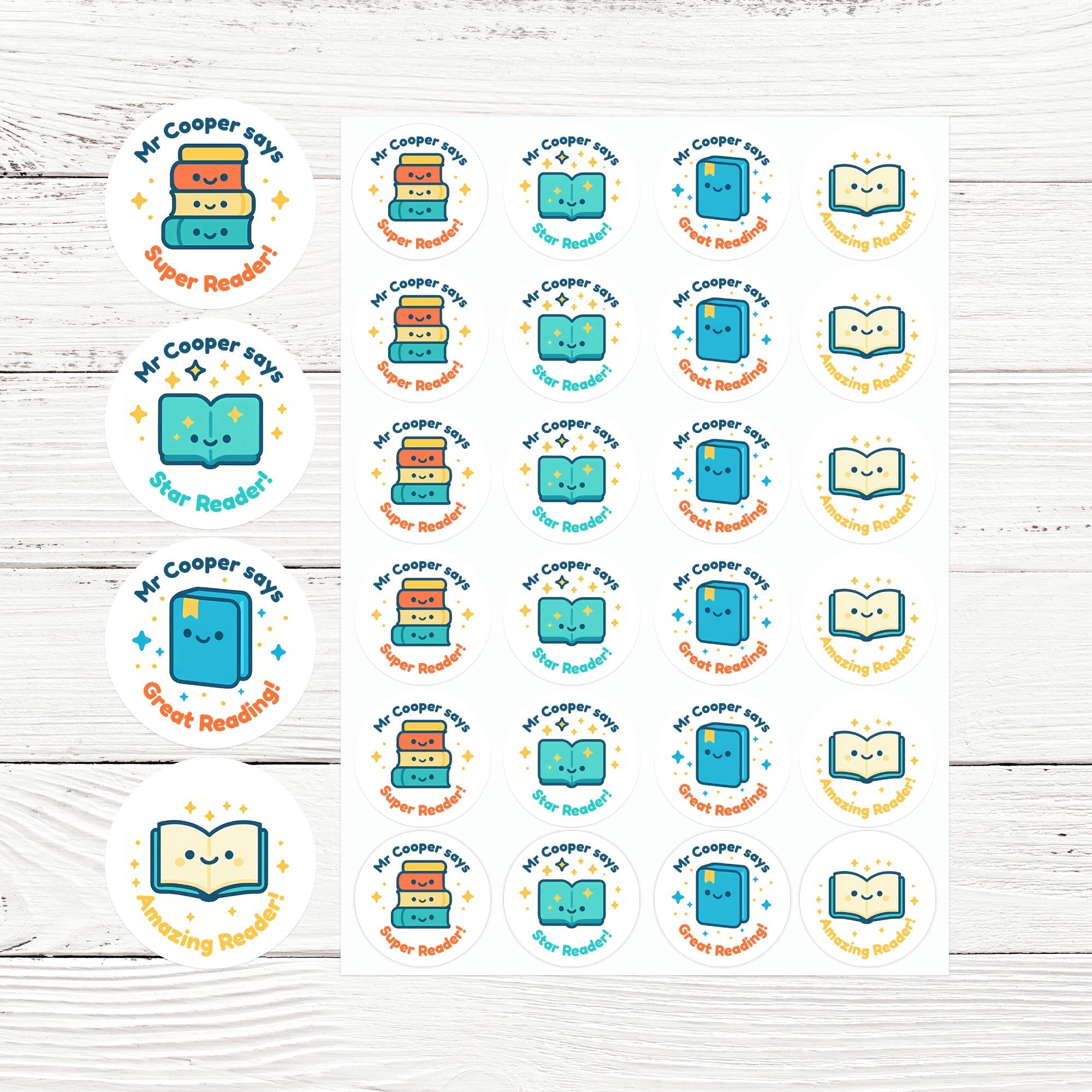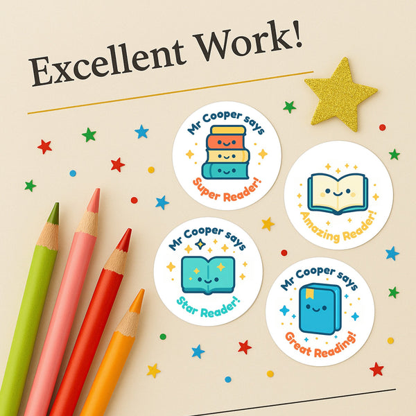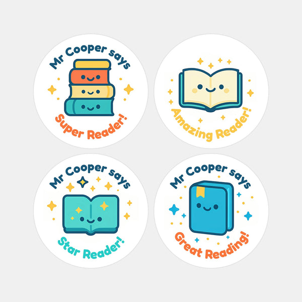 Each sticker is personalised with your name (e.g. “Mr Cooper says”), creating a positive, supportive message your students will love seeing on their books and reading tasks.