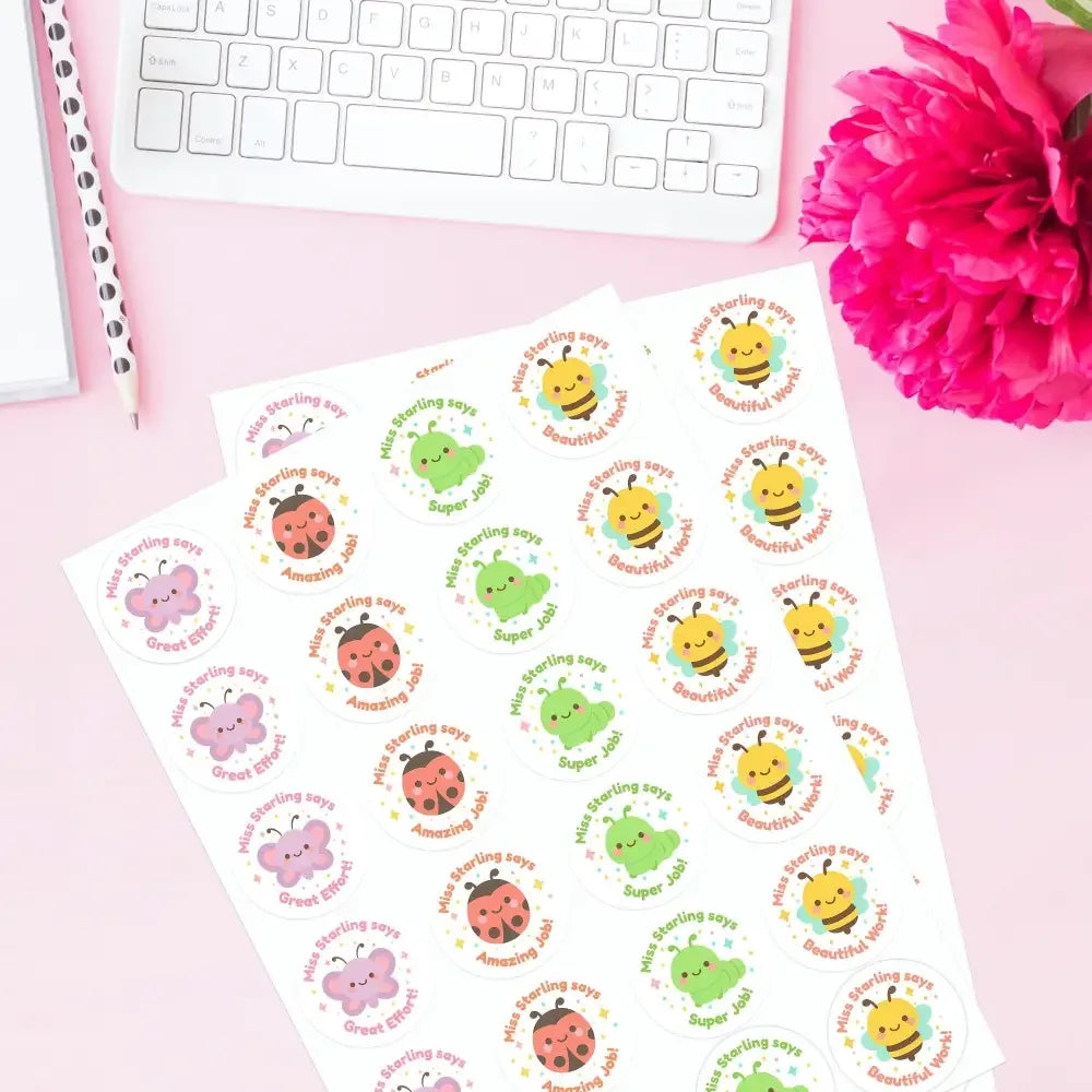 Brighten your classroom with these adorable personalised bug and critter teacher reward stickers! Featuring sweet, pastel kawaii-style insects, a cute butterfly, happy bee, cheerful ladybug and friendly caterpillar, with encouraging phrases like “Great Effort!”, “Beautiful Work!”, “Amazing Job!” and “Super Job!”, these stickers are perfect for motivating young learners and celebrating every achievement.