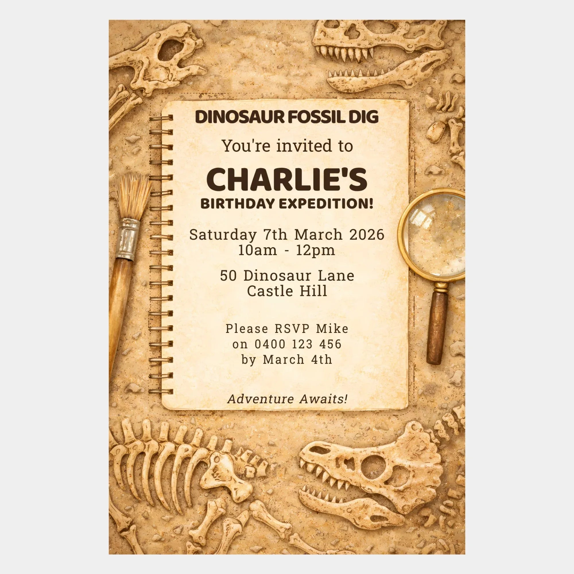 This exciting dinosaur-themed design features realistic fossil bones, a magnifying glass, and an expedition-style notebook layout set against a sandy dig site background. With its earthy tones and adventurous feel, it’s perfect for a dinosaur fossil dig or prehistoric birthday party.
