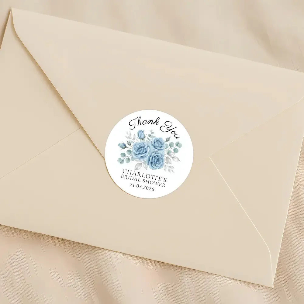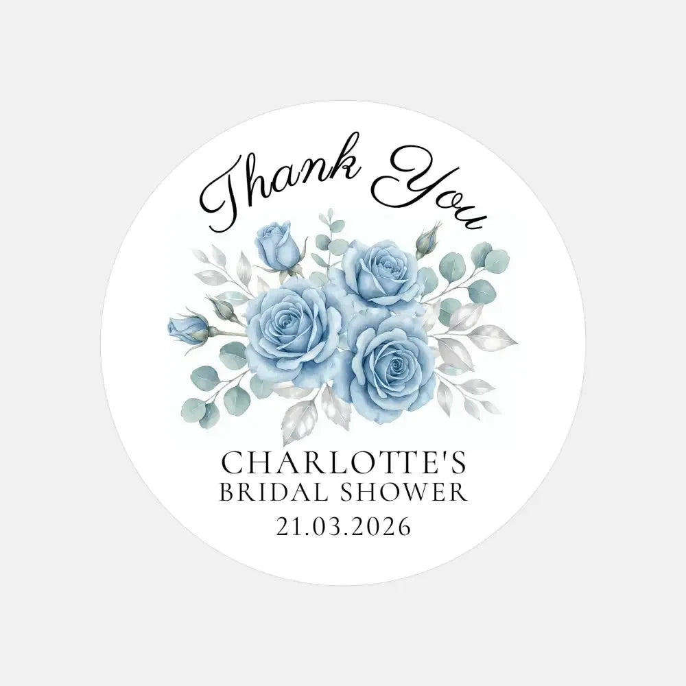 Personalised Dusty Blue Rose Bridal Shower Thank You Stickers – Custom Name & Date – Watercolour Floral Favour Labels