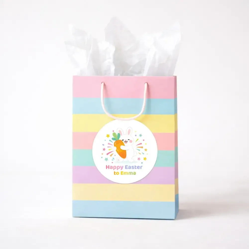 Featuring an adorable bunny hugging a bright carrot, surrounded by playful confetti and cheerful Easter colours, this design is perfect for Easter baskets, egg hunt prizes, treat bags, and gift wrapping straight from the Easter Bunny.