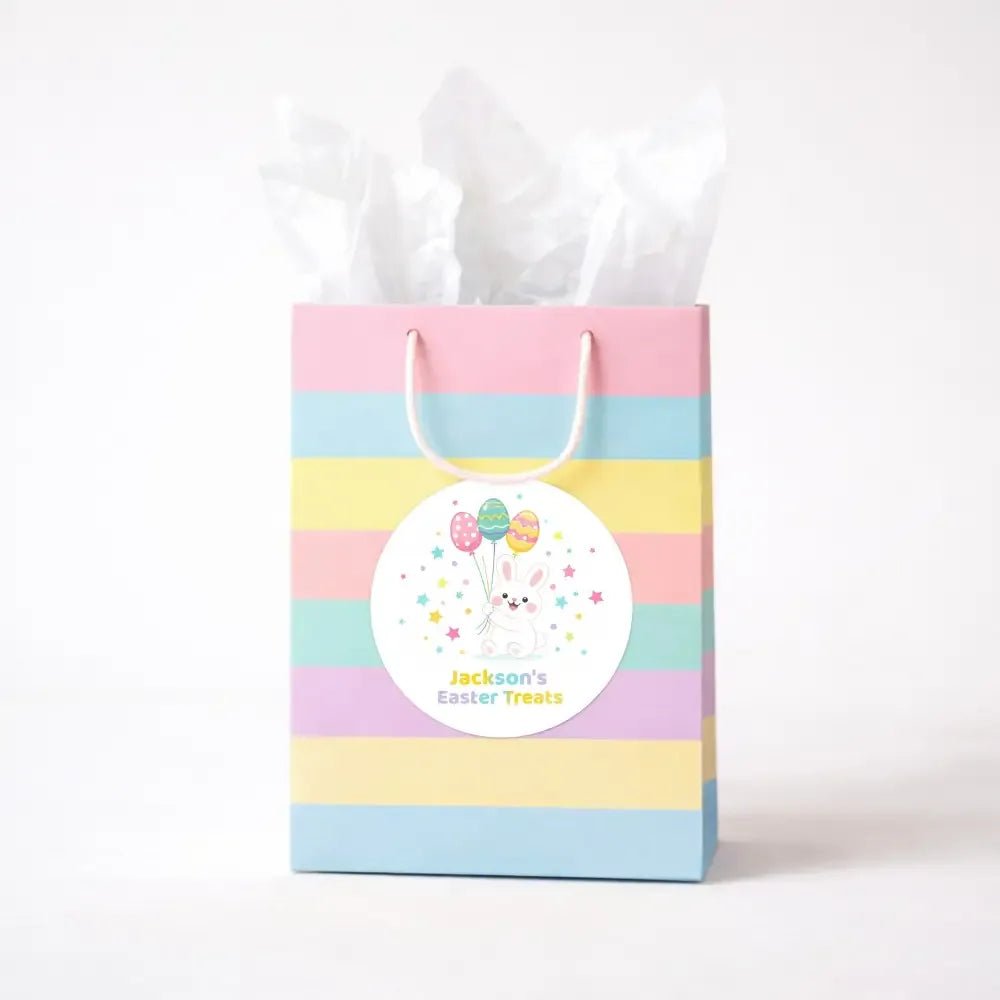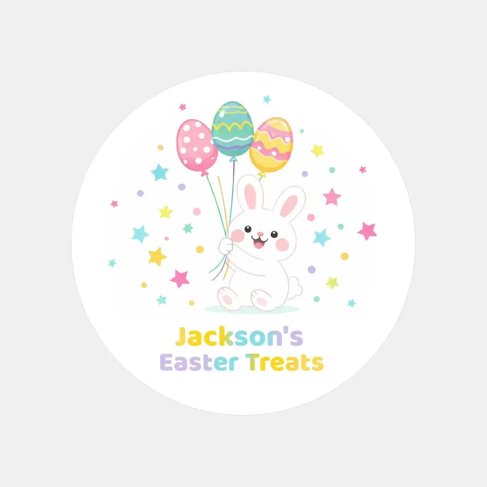 Make Easter treats extra special with these personalised Easter treat stickers, featuring an adorable bunny holding colourful Easter egg balloons. Designed to delight kids and brighten every Easter surprise, these stickers add instant charm to treat bags, gift boxes, and party favours.