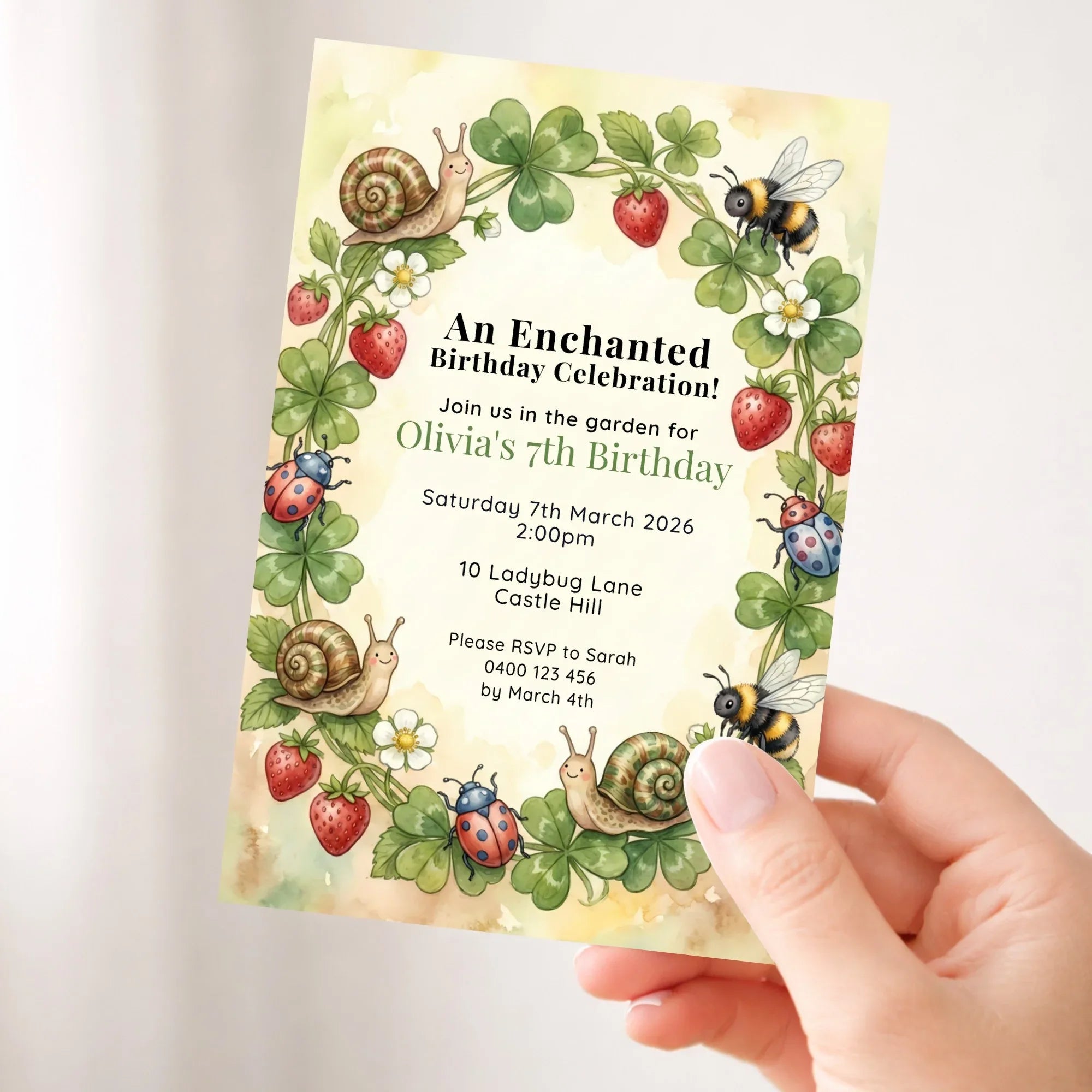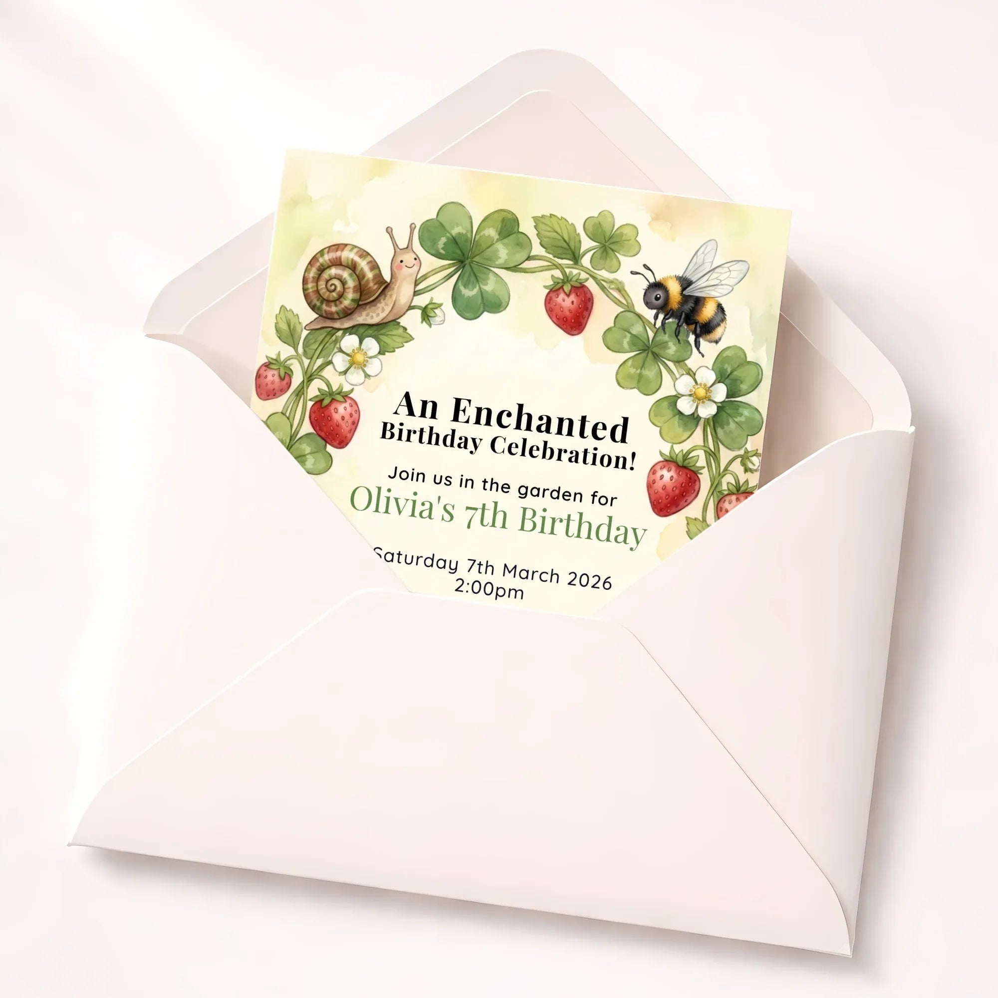 This whimsical garden-themed invitation showcases delicate greenery, strawberries, ladybirds, bees, and sweet snails arranged in a beautiful wreath-style layout. With its warm, earthy tones and gentle hand-painted style, it’s perfect for children who love nature, gardens, and outdoor adventures.
