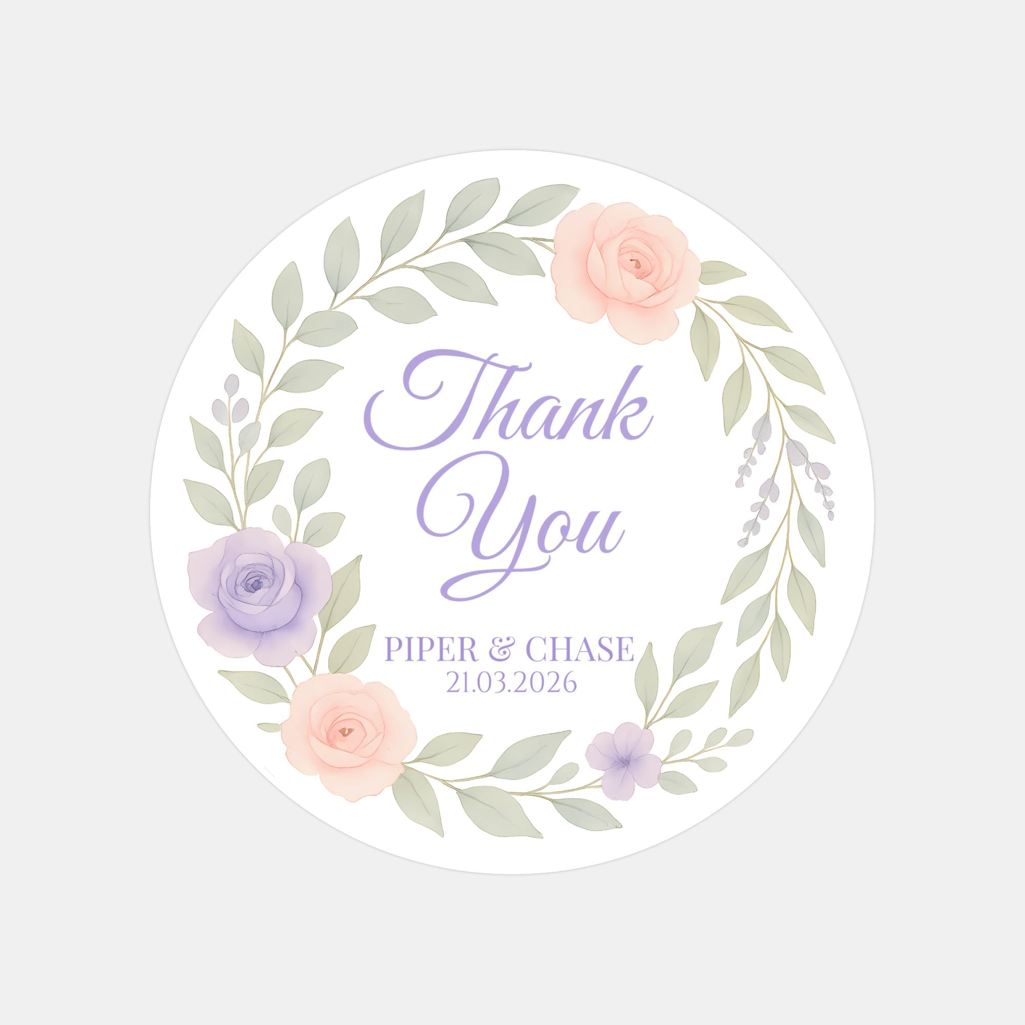 Add a soft, elegant touch to your wedding favours with these beautiful personalised floral thank-you stickers. Featuring a delicate pastel wreath of lavender and blush flowers with graceful script lettering, these stickers bring a refined, romantic finish to your special day.