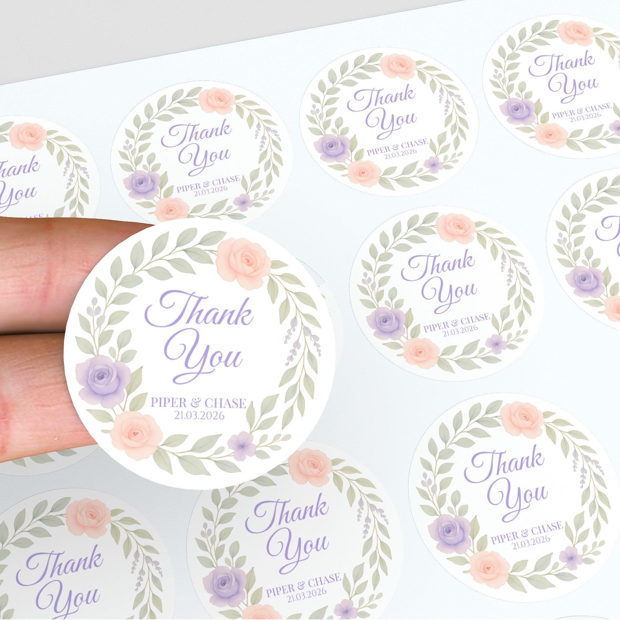 Personalised Floral Wedding Thank You Stickers – Custom Name & Date Pastel Wreath Labels