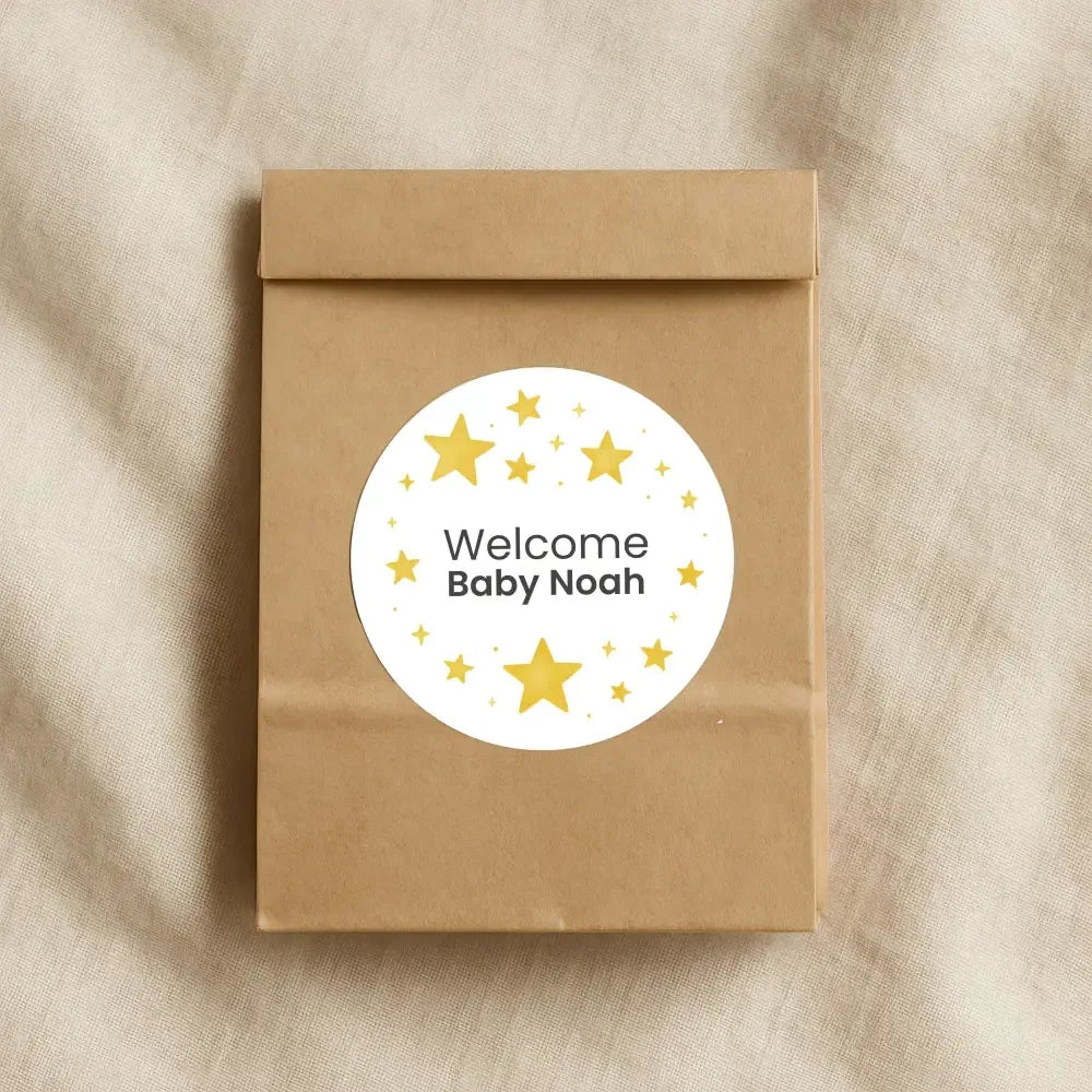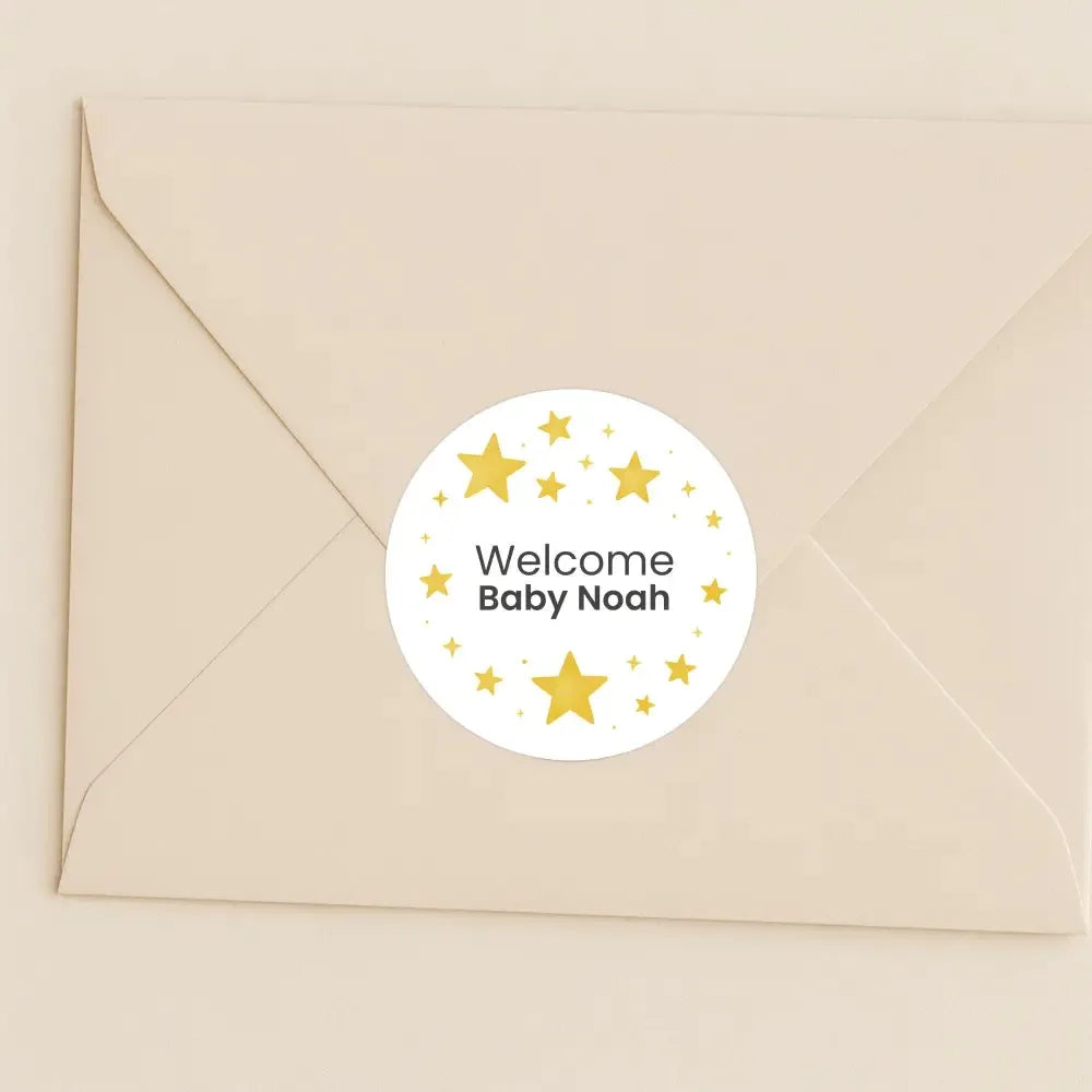 Personalised Golden Stars Welcome Baby Stickers – Celestial Gender-Neutral Favour Labels