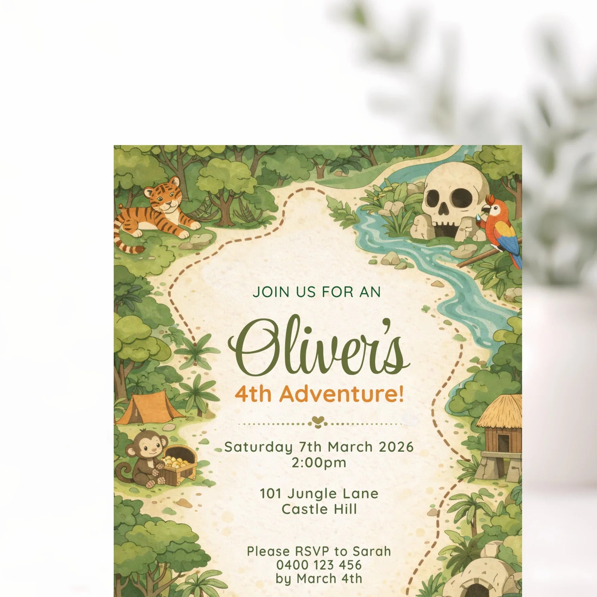 Fun, imaginative, and full of adventure, this jungle adventure birthday invitation is the perfect way to start an unforgettable celebration.
