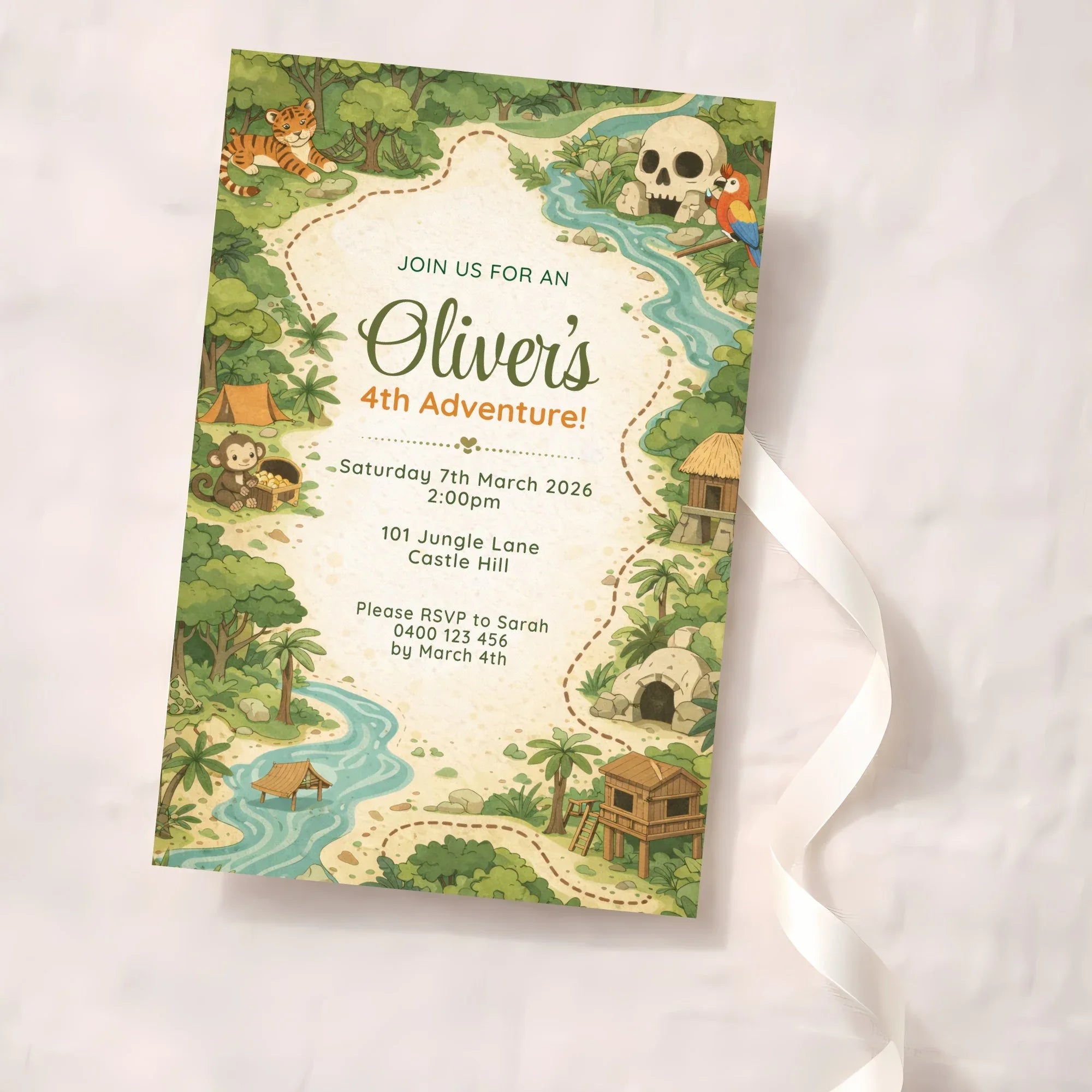 This unique invitation features a hand-illustrated jungle scene complete with winding paths, rivers, huts, and friendly jungle animals, creating a fun “adventure quest” atmosphere that sparks imagination and excitement.