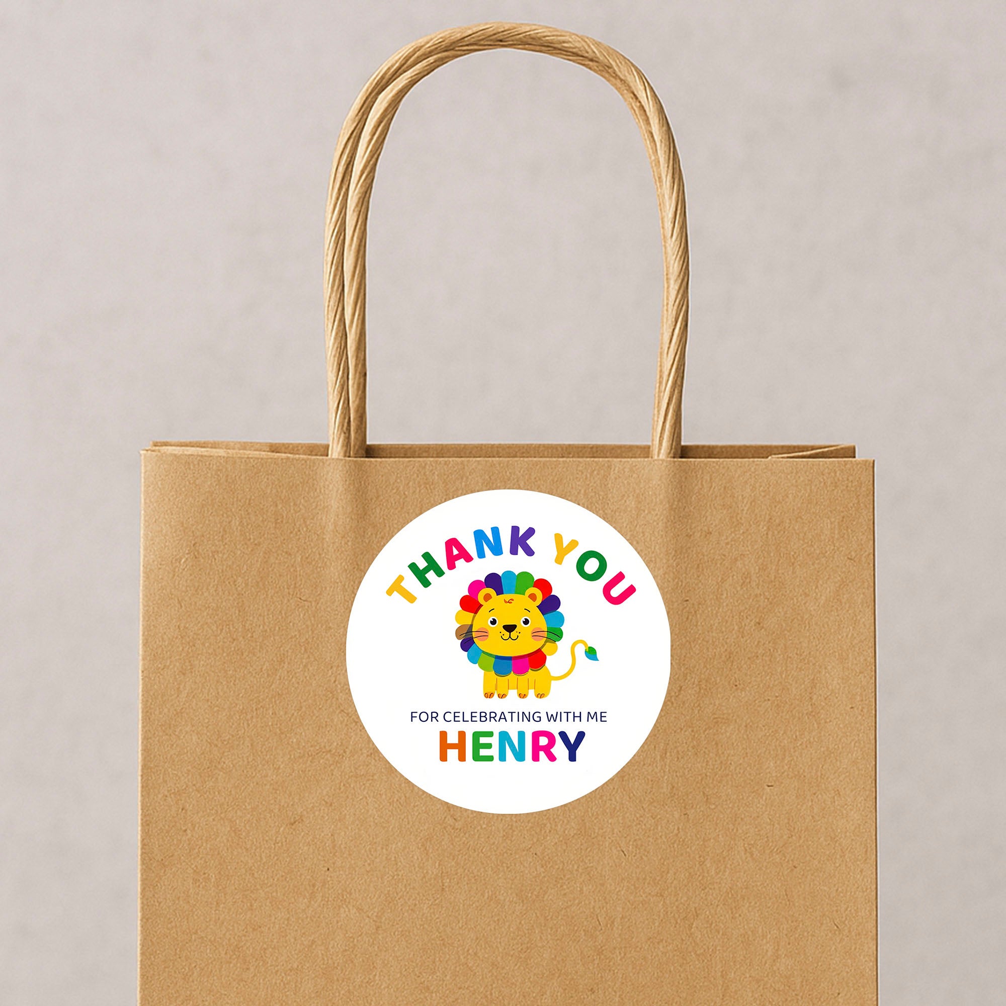 Personalised Kids Birthday Stickers Lion Rainbow Thank You Name Party Favour
