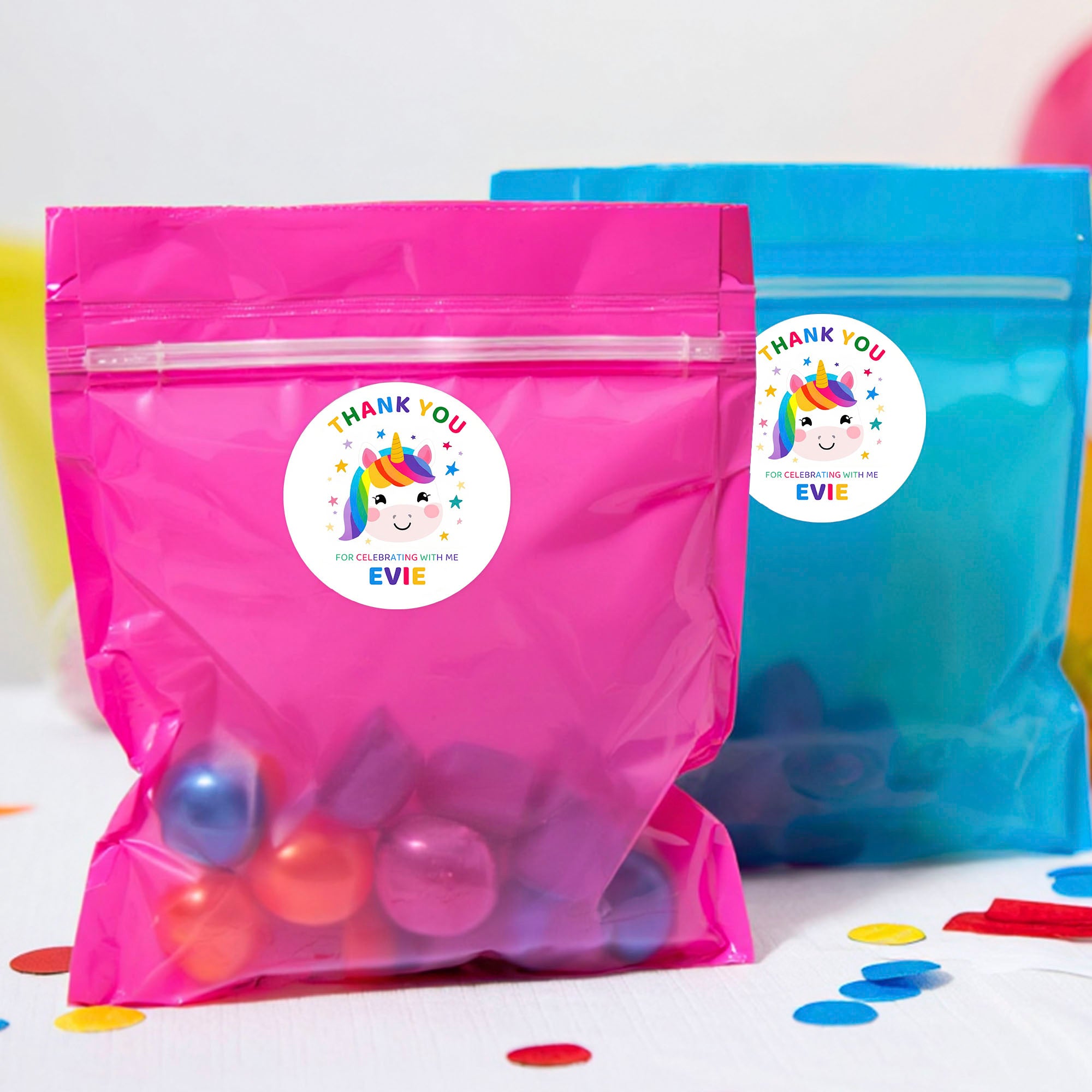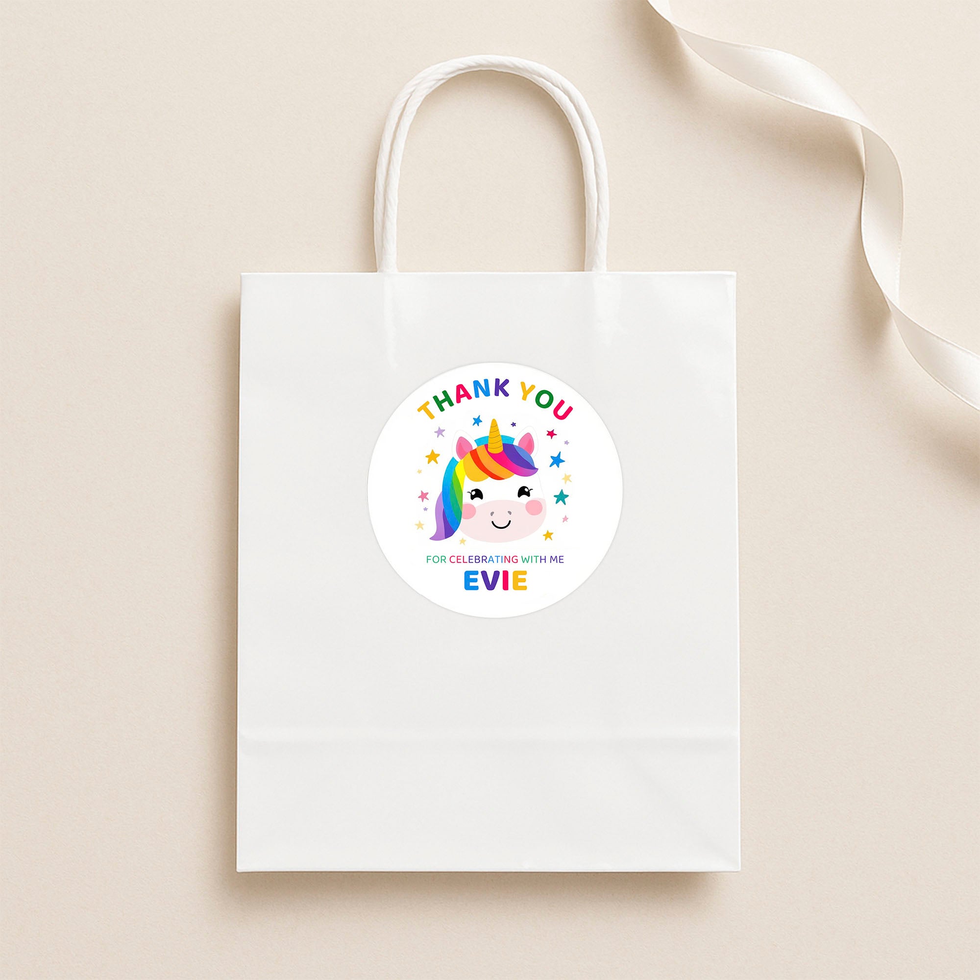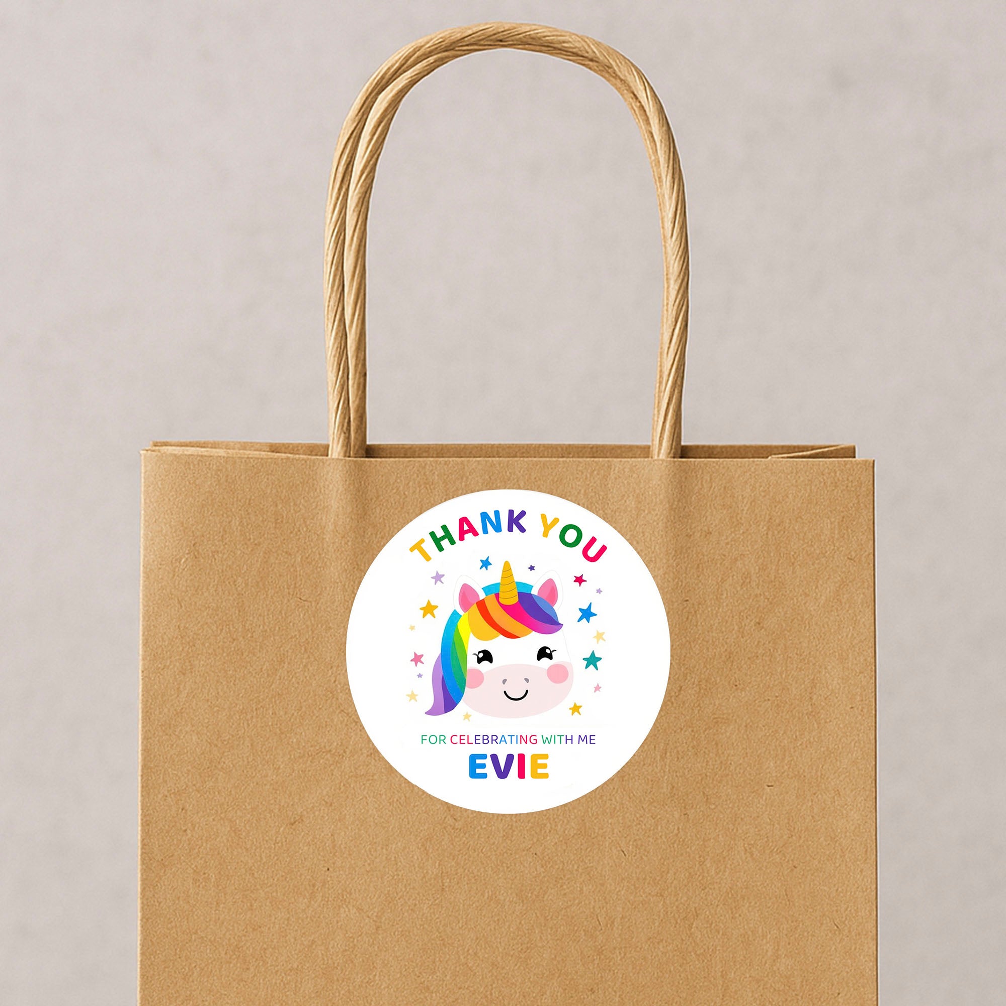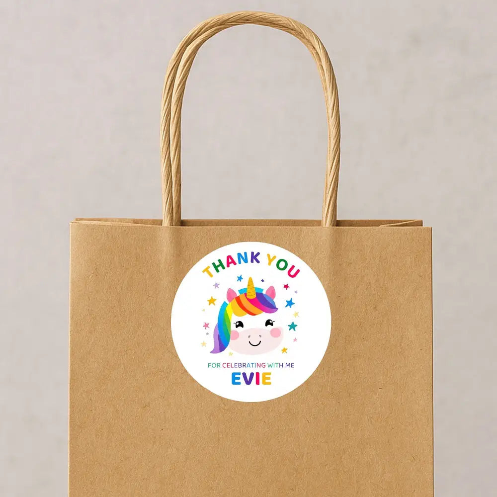 Personalised Kids Birthday Stickers Unicorn Rainbow Thank You Name Party Favour