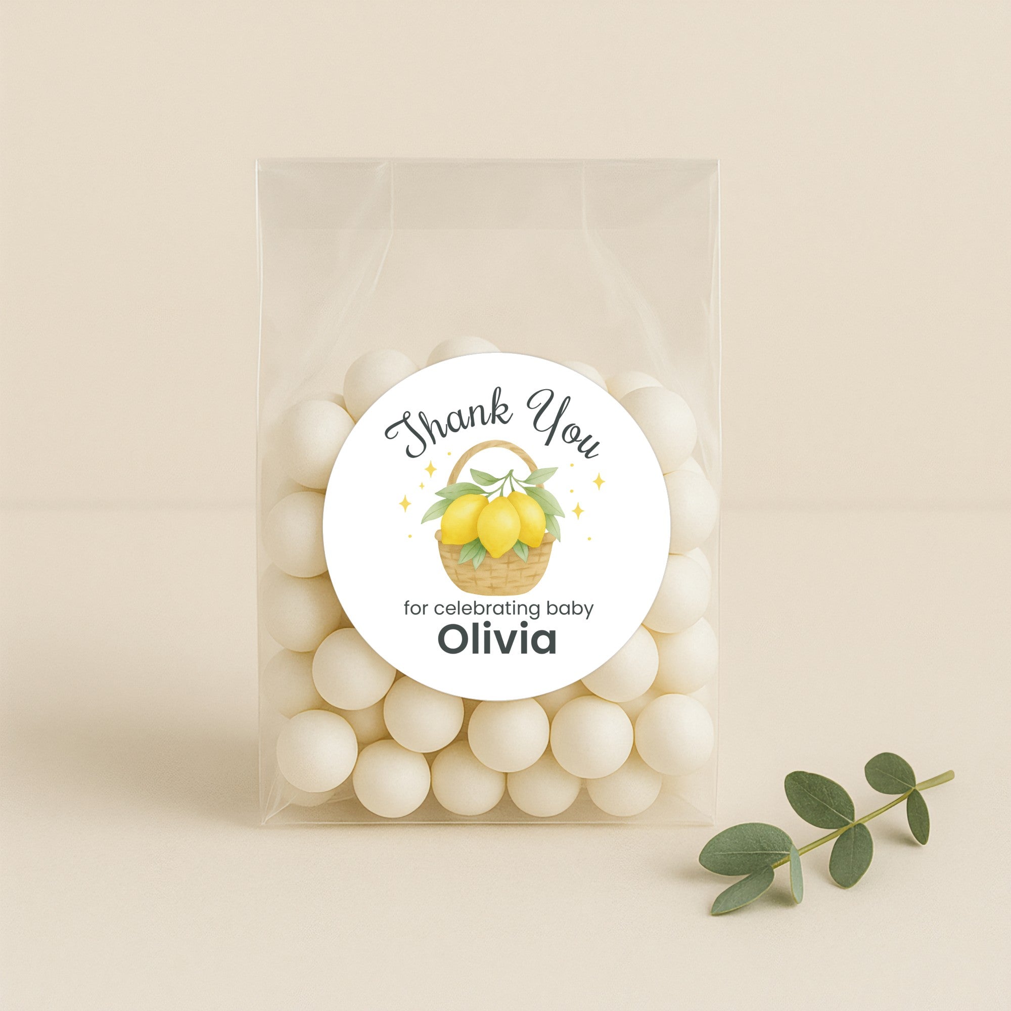 Send guests home with a sweet touch of sunshine using these personalised lemon basket thank you stickers. Featuring a hand-painted watercolour basket filled with bright yellow lemons and soft greenery, accented with tiny golden sparkles, this cheerful design brings a warm, fresh and gender-neutral feel to your baby shower favours.