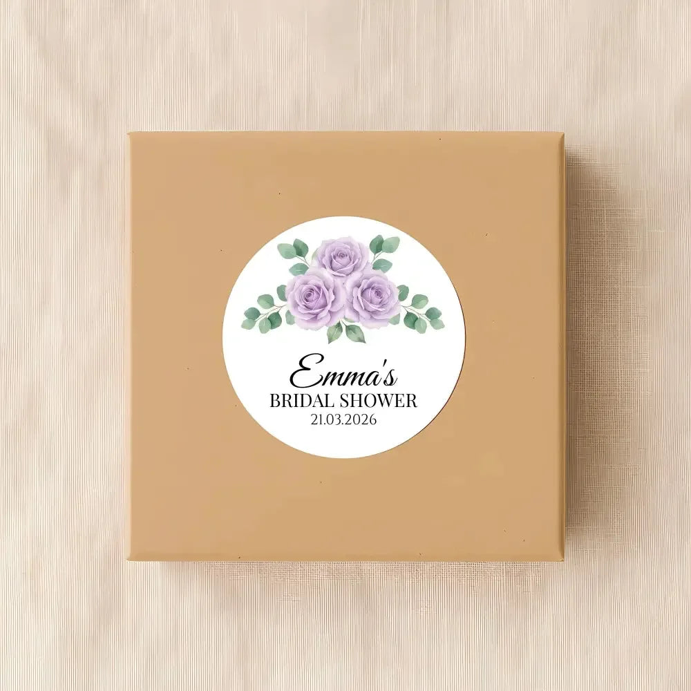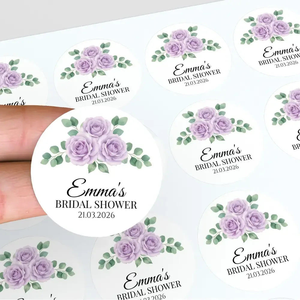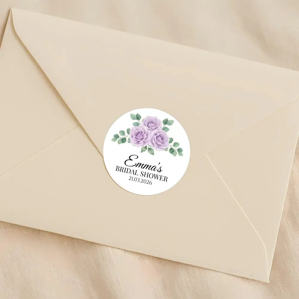 Personalised Lilac Rose Bridal Shower Stickers – Custom Name & Date Favour Labels – Watercolour Floral Party Stickers