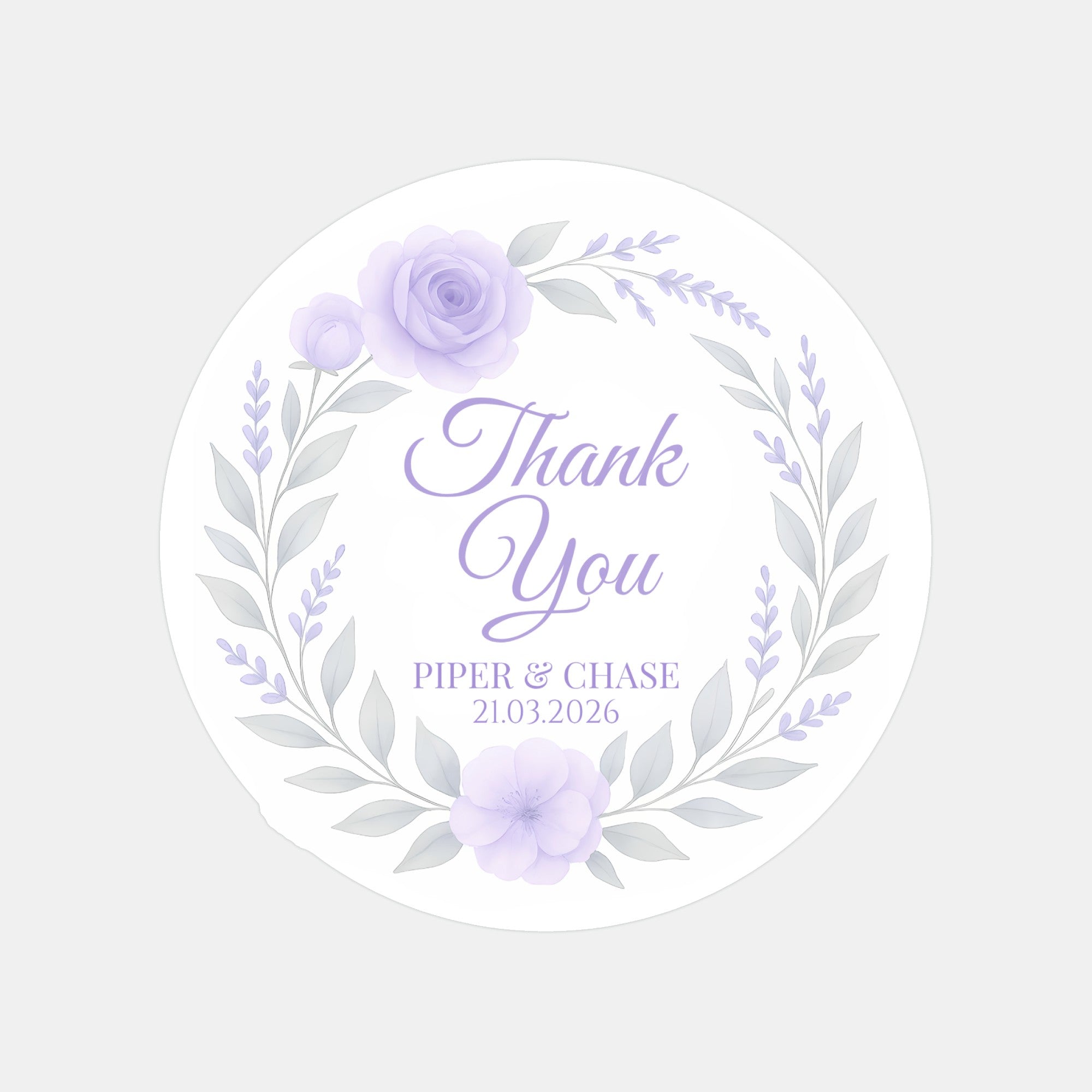 Elevate your wedding favours with these elegant personalised lilac rose and lavender Thank You stickers. Featuring a soft hand-painted wreath of lavender sprigs, muted sage-grey leaves and delicate lilac blooms, this design adds a romantic, timeless touch to your special day.