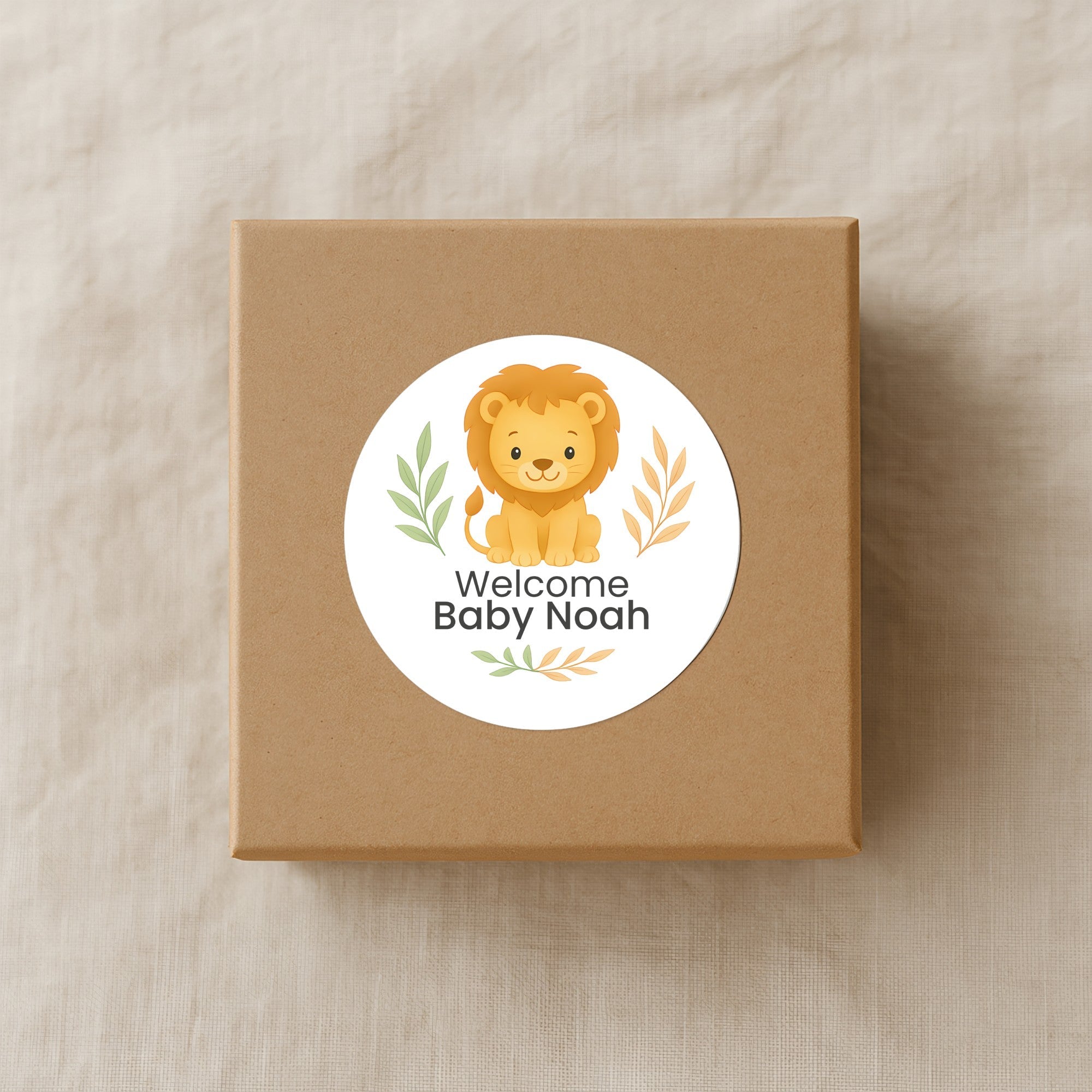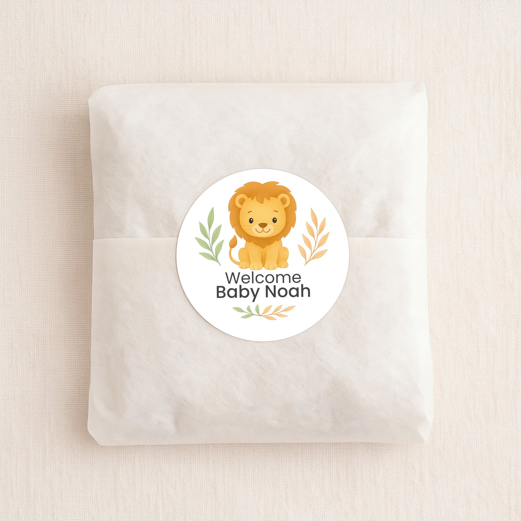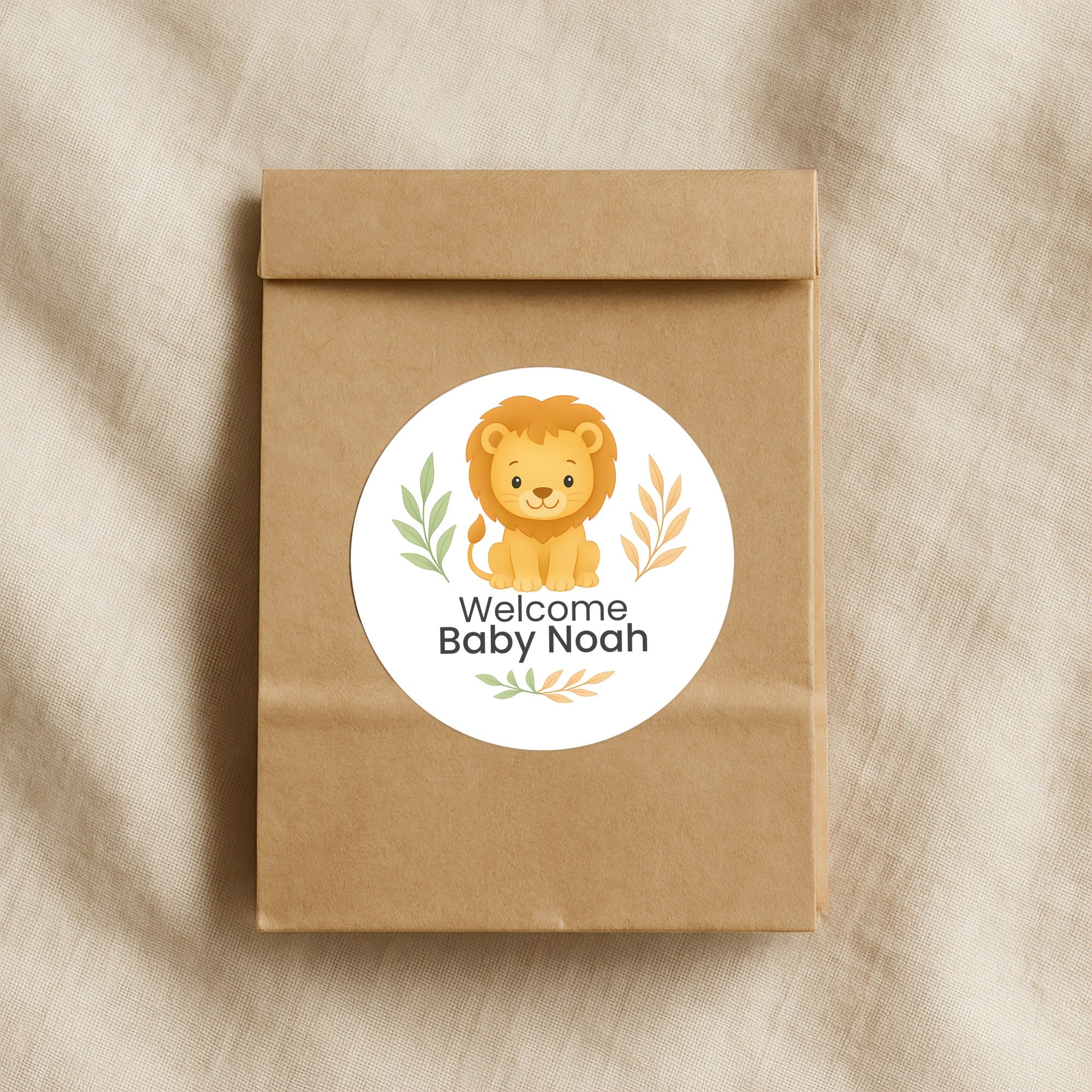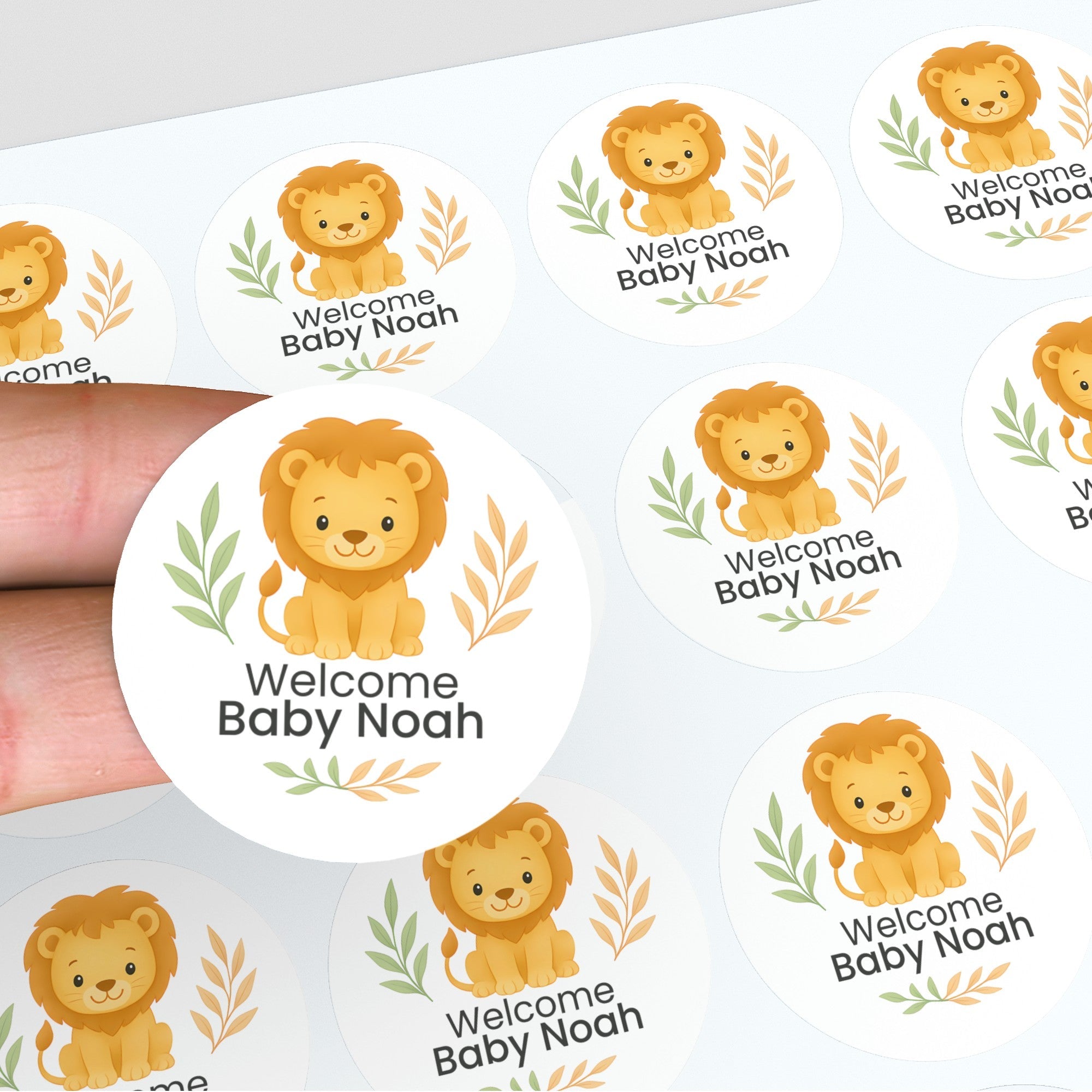 Personalised Lion Baby Shower Stickers – Safari Welcome Baby Favour Labels