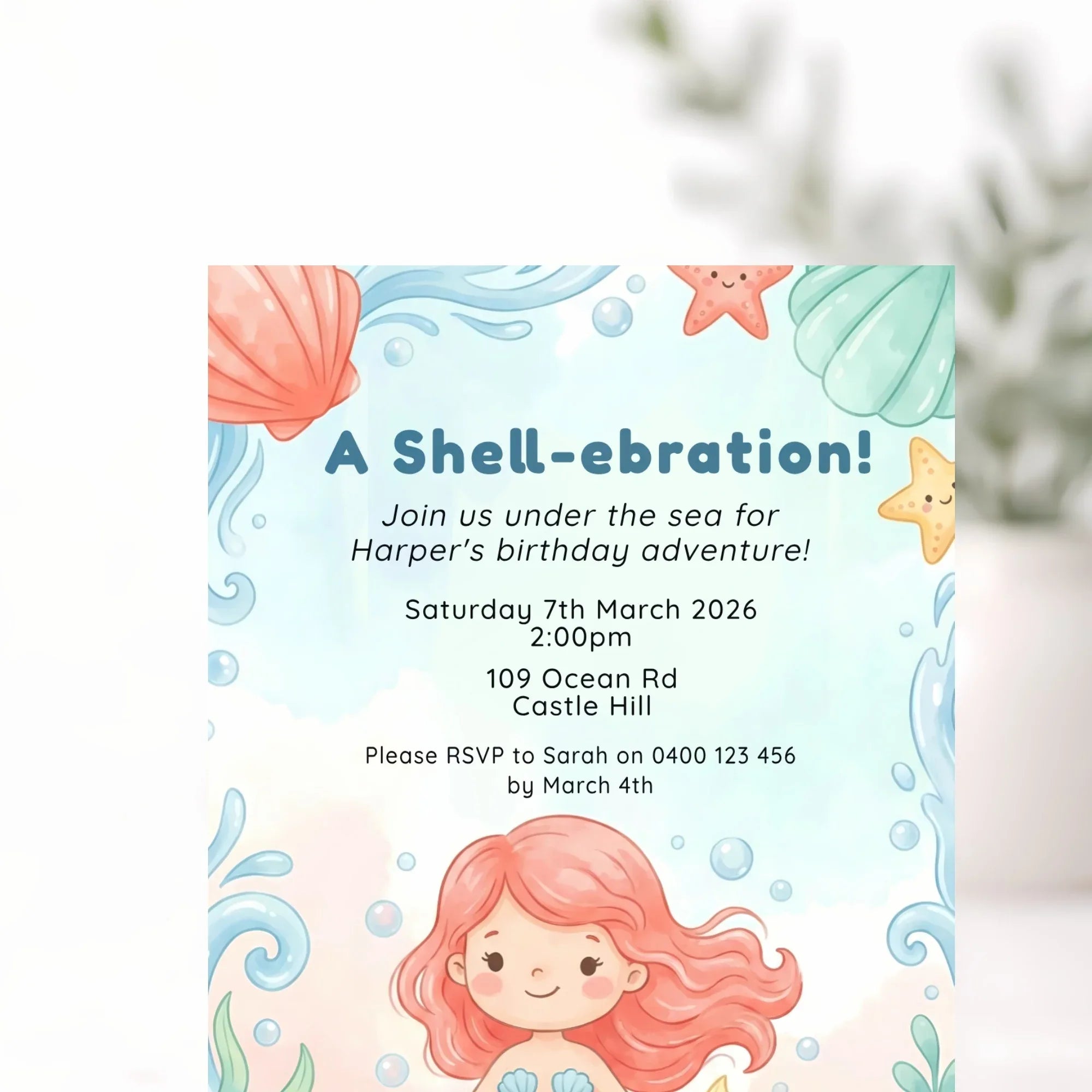 This cheerful under-the-sea design features a sweet illustrated mermaid surrounded by shells, bubbles, sea plants and smiling starfish. With its soft pastel colours and playful cartoon style, this invitation is perfect for a fun, child-friendly mermaid birthday party.