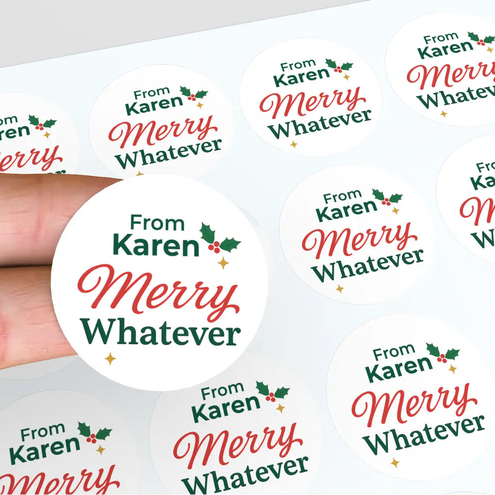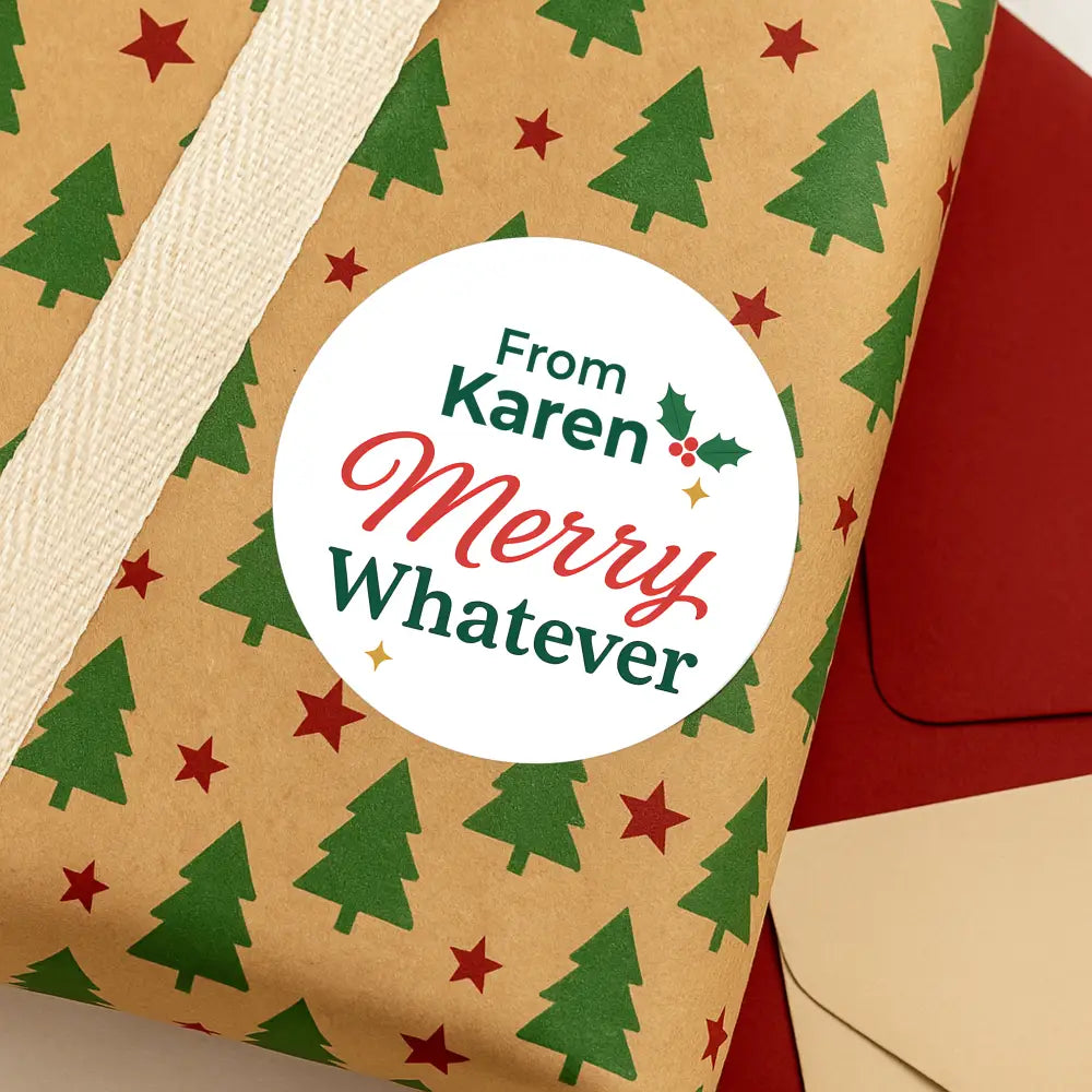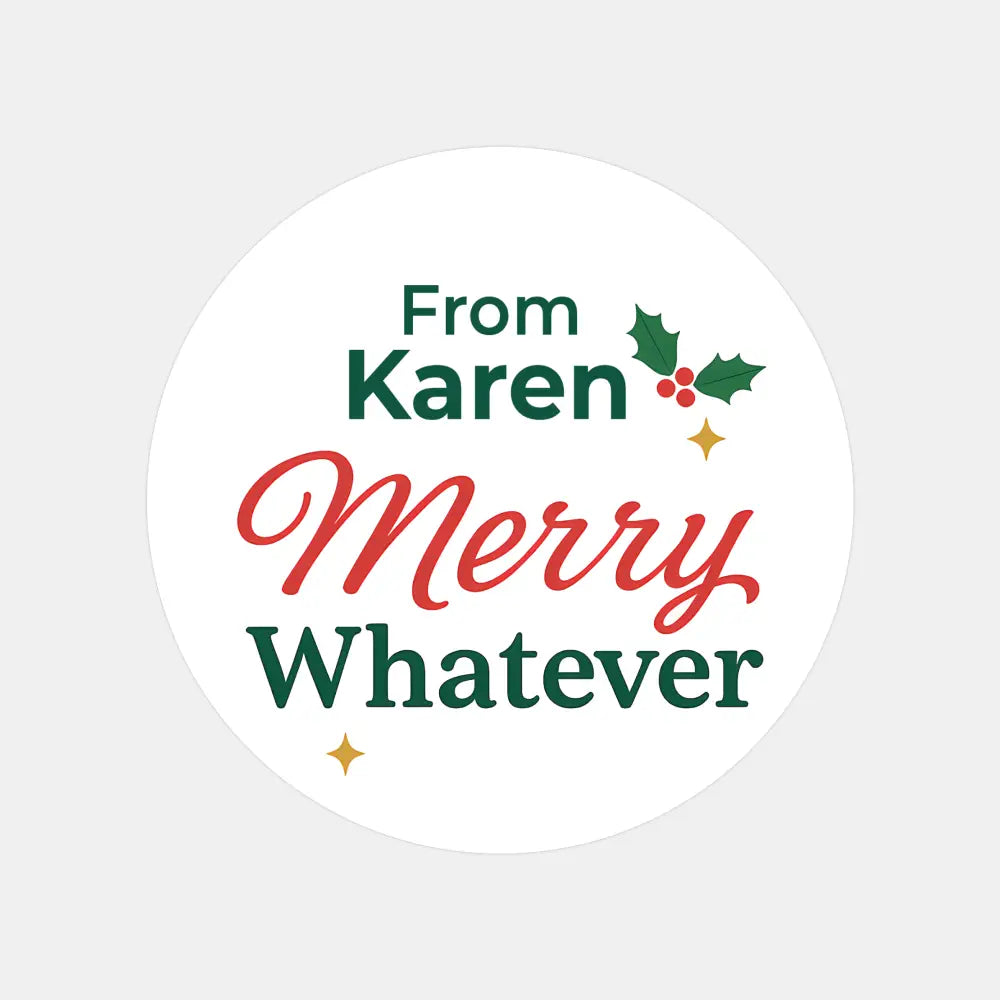 The “Merry Whatever” sticker perfectly captures that mix of Christmas spirit and mild seasonal sarcasm. With playful red and green lettering, holly leaves, and a dash of sparkle, it’s the ultimate tag for gifts from someone who’s over it but still showing up.