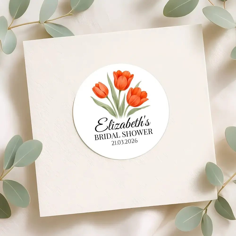 Bring a bright and cheerful touch to your bridal shower favours with these personalised orange tulip stickers. Featuring vibrant watercolour tulips in rich shades of orange with soft green leaves, this fresh floral design adds a joyful, modern and elegant feel to your celebration.