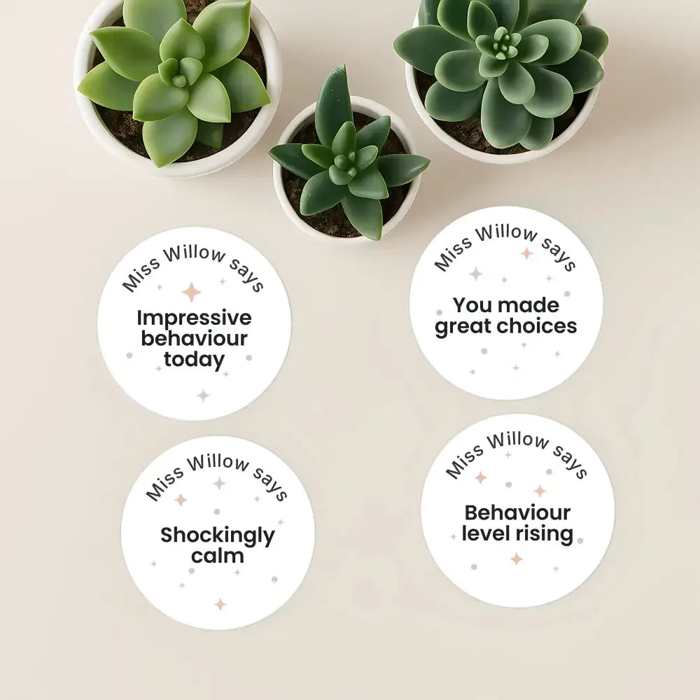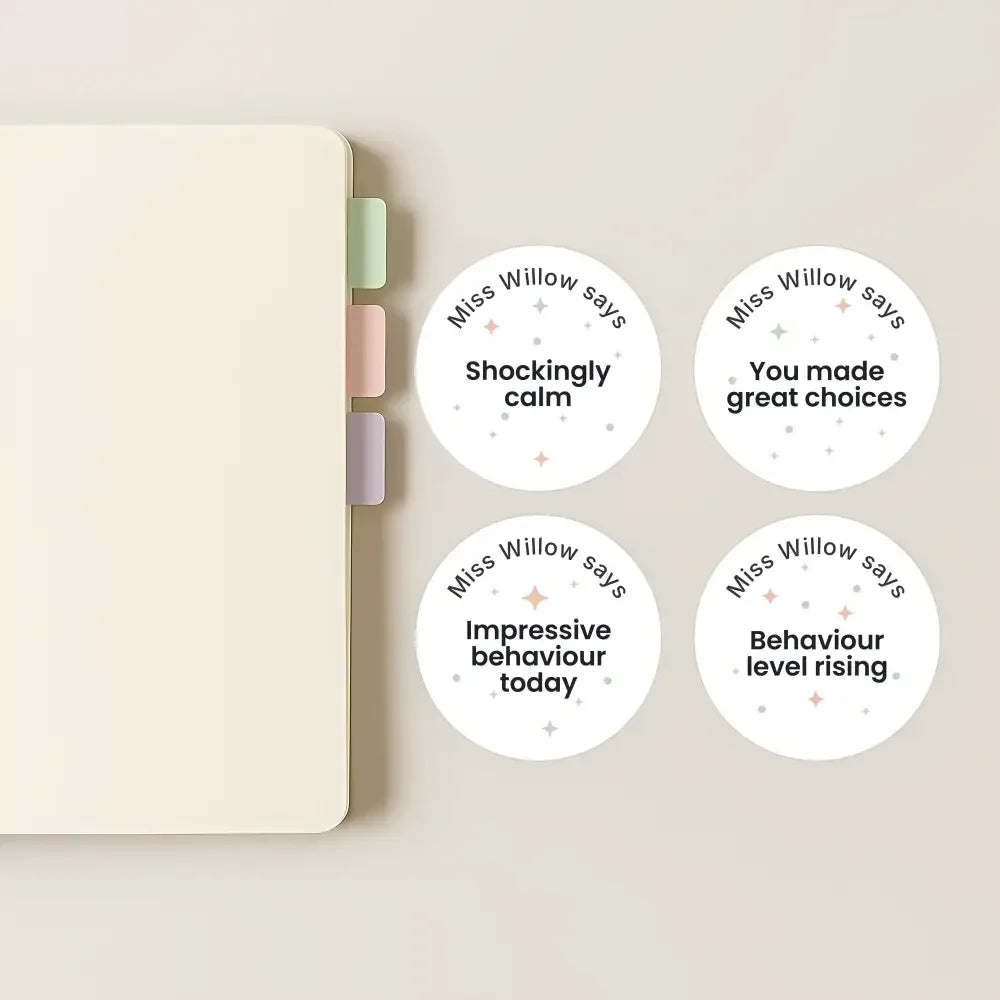 Each sticker is personalised with your name (e.g. “Miss Willow says”) and designed in a clean, modern style that feels age-appropriate for upper primary and high school classrooms.