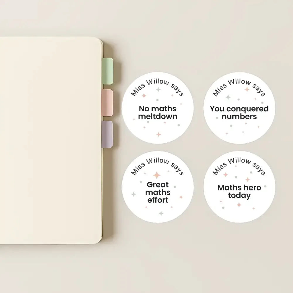 Make maths motivation fun (with a cheeky twist) using these personalised pastel confetti teen maths reward stickers. Featuring soft star and dot accents, each sticker includes relatable maths-themed phrases like “No maths meltdown”, “You conquered numbers”, “Great maths effort” and “Maths hero today”, perfect for acknowledging improvement, persistence and those big (or small) maths wins.