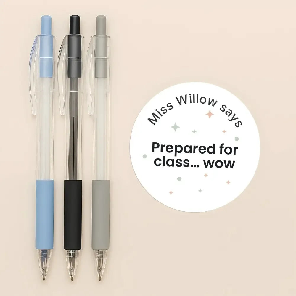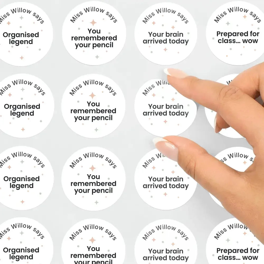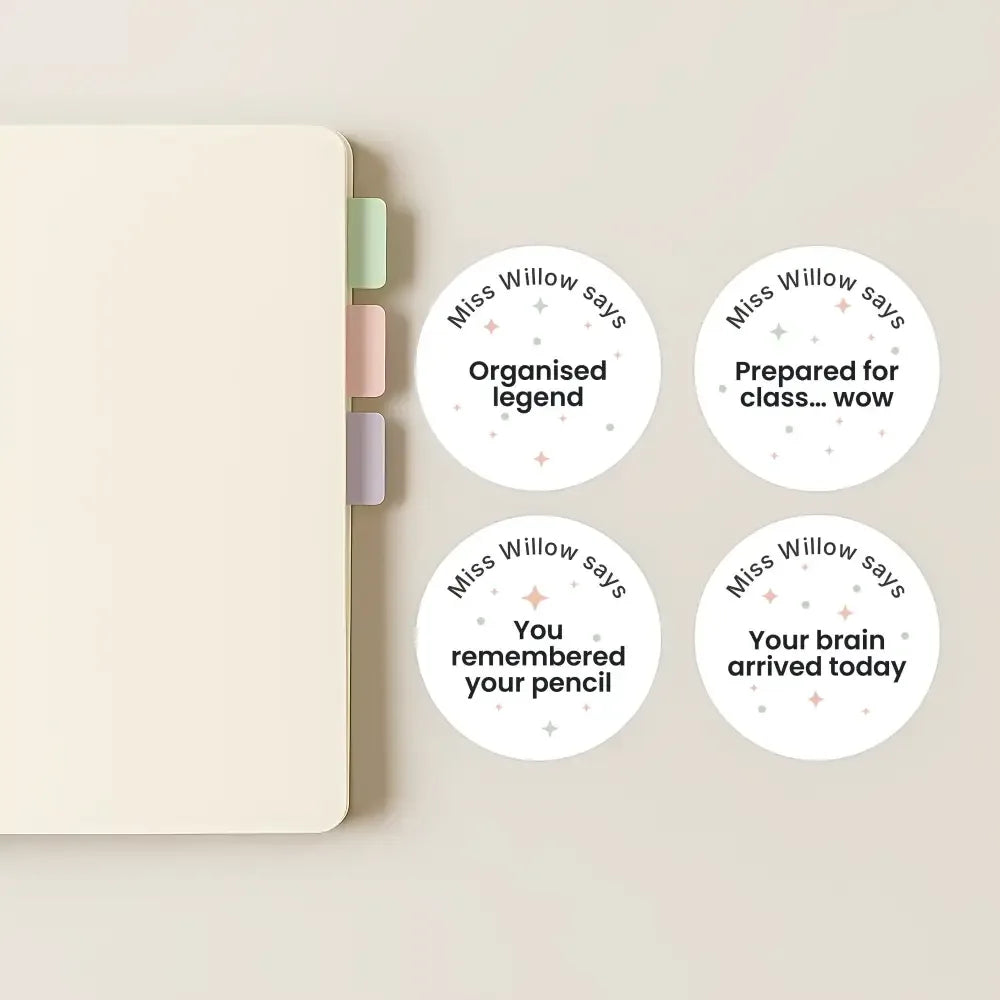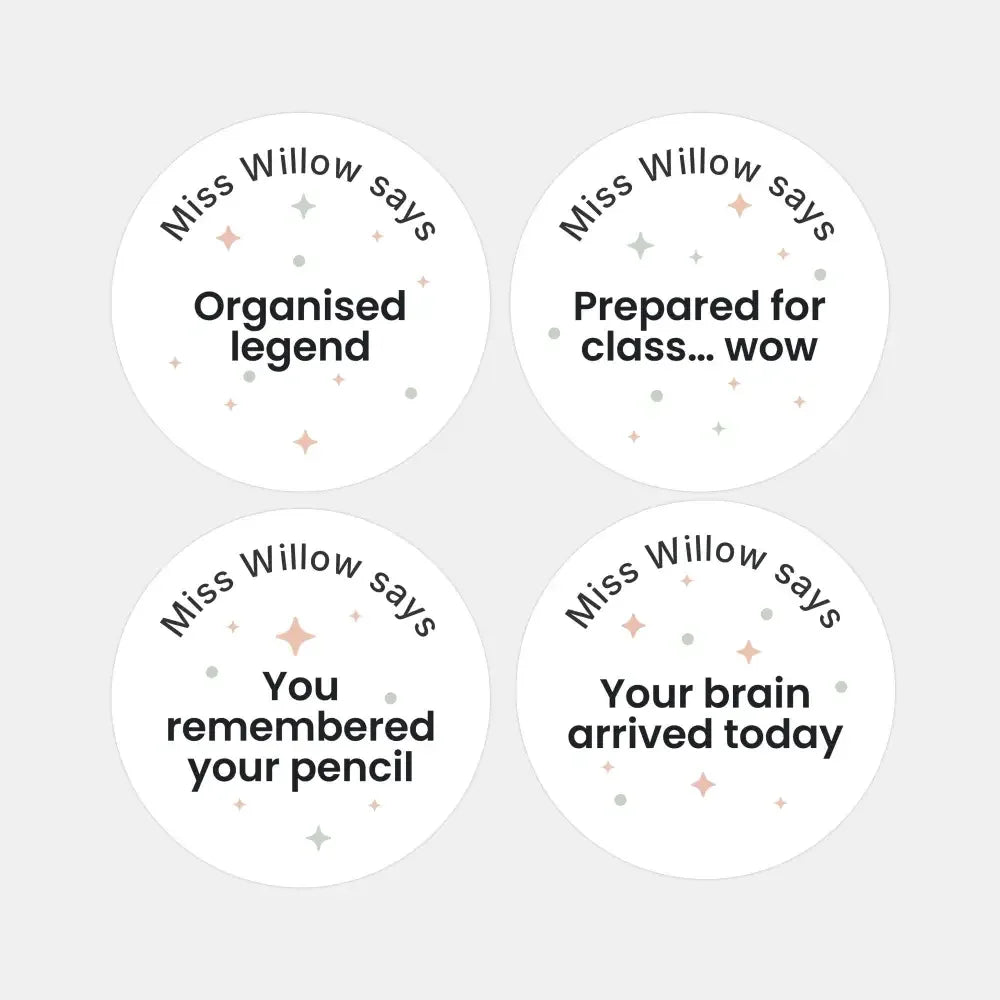 Each sticker is personalised with your name (e.g. “Miss Willow says”) and designed in a clean, modern style that feels mature enough for upper primary and high school students while still adding a fun, humorous twist.