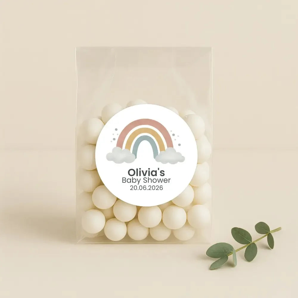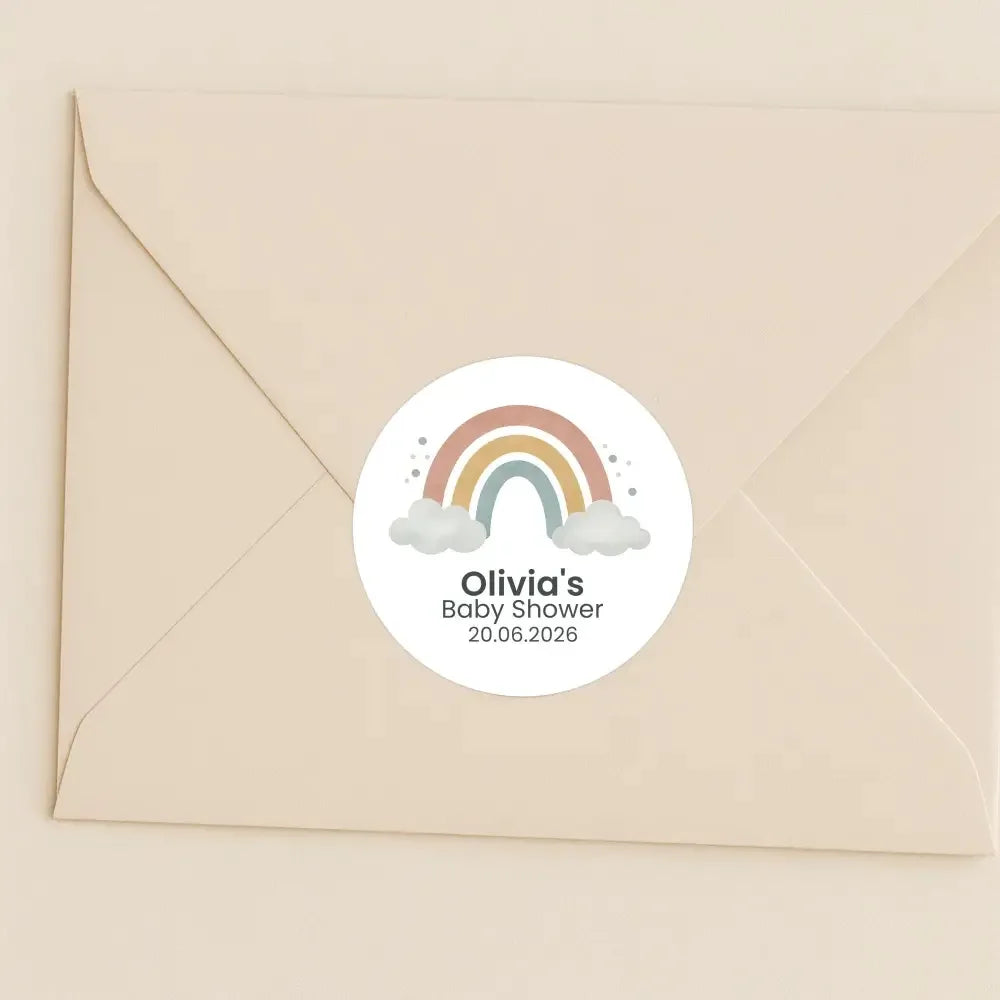 Personalised Pastel Rainbow Baby Shower Stickers – Scandi Boho Gender-Neutral Favour Labels