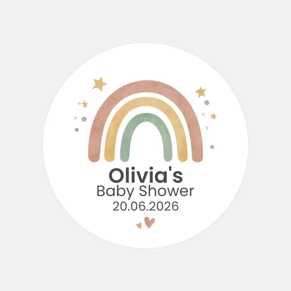 Bring a sweet, modern touch to your baby shower favours with these personalised pastel rainbow stickers. Featuring a soft, Scandinavian-inspired rainbow in muted rose, mustard and sage tones with star accents, tiny dots and a pair of tiny love hearts, this charming design adds a warm and gender-neutral feel to any celebration.