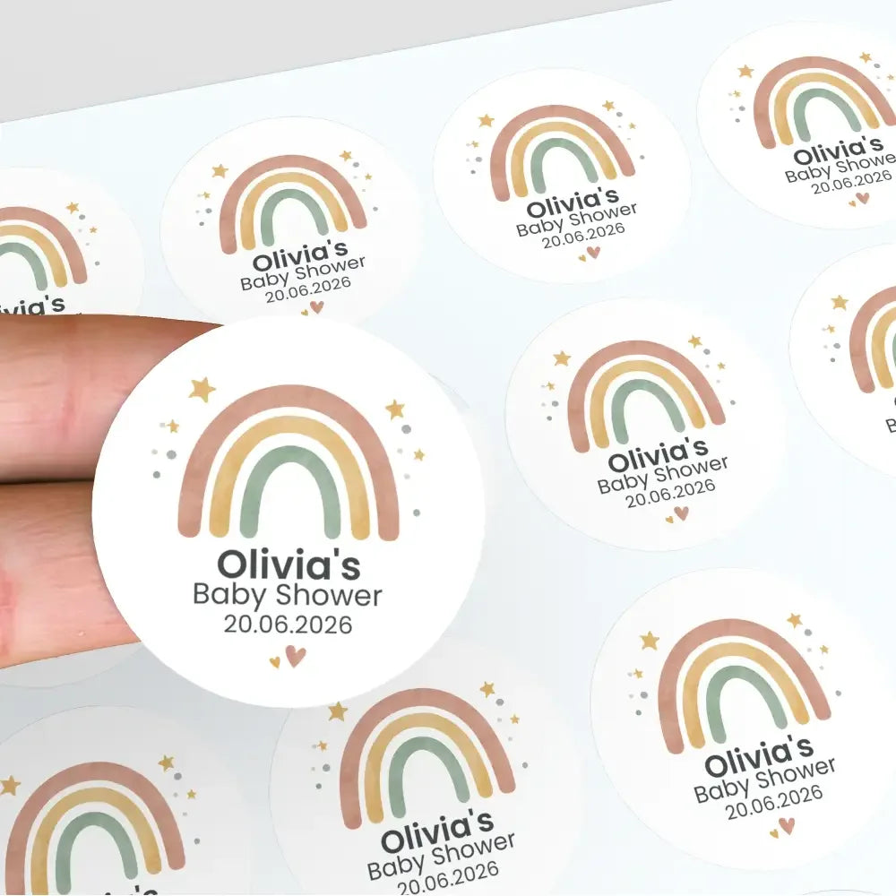 Personalised Pastel Rainbow Baby Shower Stickers with Stars – Scandi Boho Gender-Neutral Favour Labels
