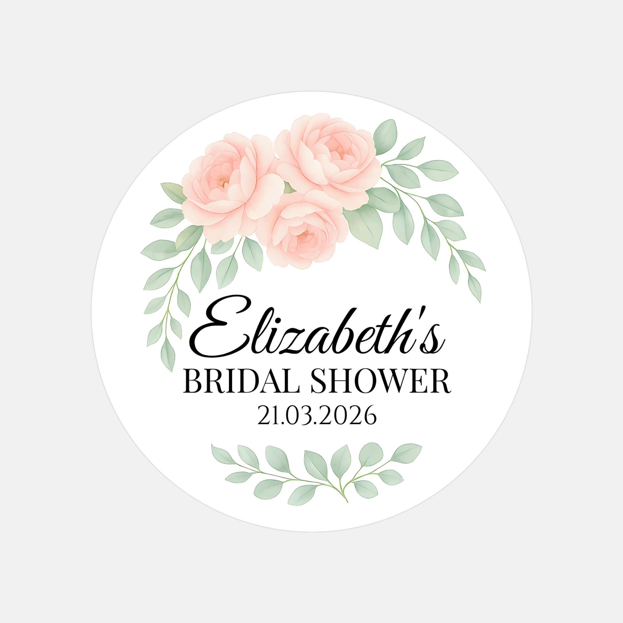 Add a soft, romantic touch to your bridal shower favours with these personalised peach rose bridal shower stickers. Featuring delicate peach garden roses with elegant sage green leaves arranged on a crisp white background, this gentle watercolour design creates a beautifully timeless and feminine look.