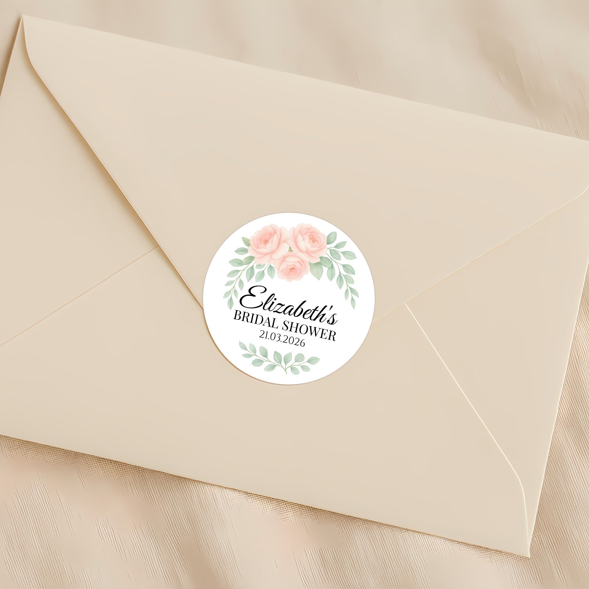 Personalised Peach Rose Bridal Shower Stickers – Custom Name & Date – Watercolour Floral Favour Labels