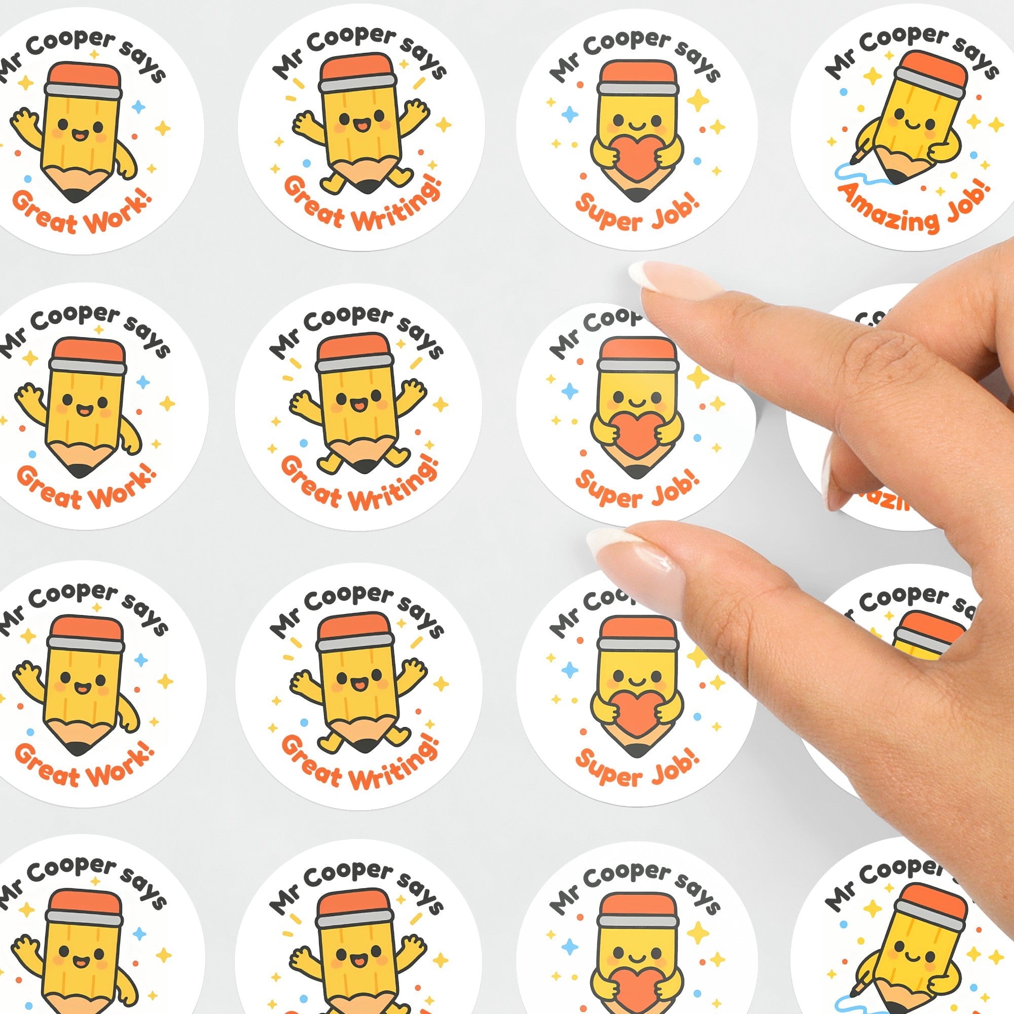 Encourage learning and celebrate progress with these fun personalised pencil teacher reward stickers. Featuring cheerful pencil characters with bright colours and playful expressions, each sticker includes positive phrases like “Great Work!”, “Amazing Job!”, “Great Writing!” and “Super Job!”, perfect for motivating students and recognising their effort.