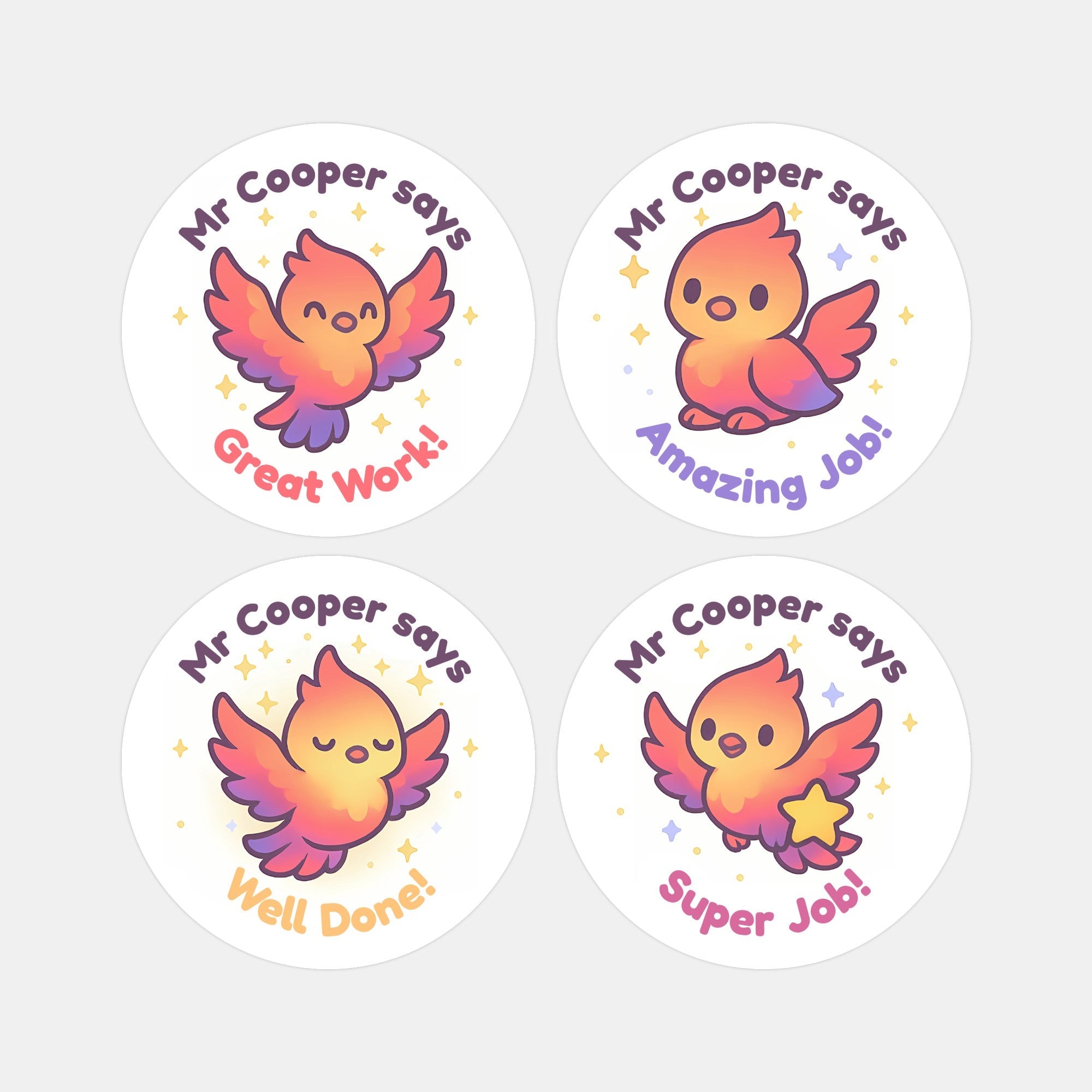 Celebrate growth, resilience, and confidence with these uplifting personalised phoenix teacher reward stickers. Featuring vibrant phoenix characters in warm sunset tones, each sticker includes encouraging phrases like “Great Work!”, “Amazing Job!”, “Well Done!” and “Super Job!”, perfect for recognising effort, progress, and perseverance.