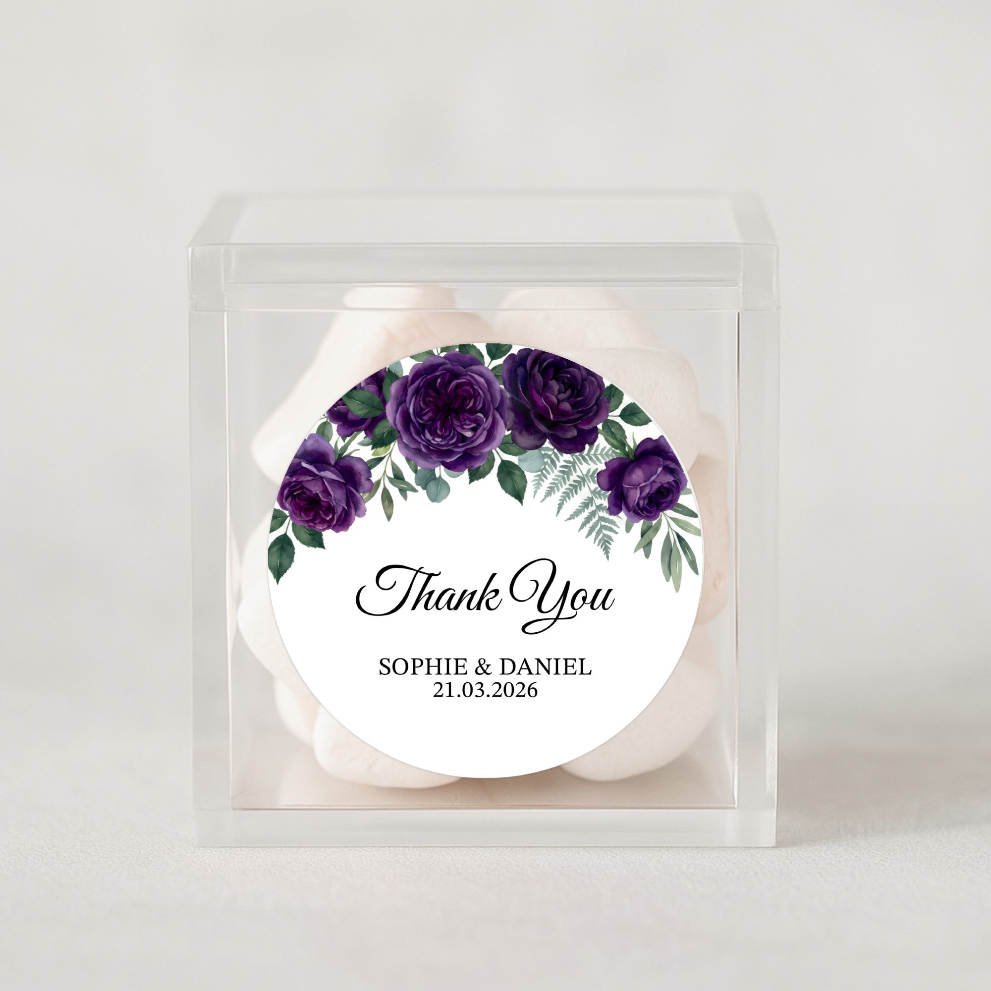 Add a touch of luxurious elegance to your wedding favours with these personalised deep plum rose Thank You stickers. Featuring rich hand-painted plum and blackberry-toned roses, paired with soft greenery and detailed fern leaves, this design creates a dramatic, romantic aesthetic ideal for evening, moody or formal weddings.