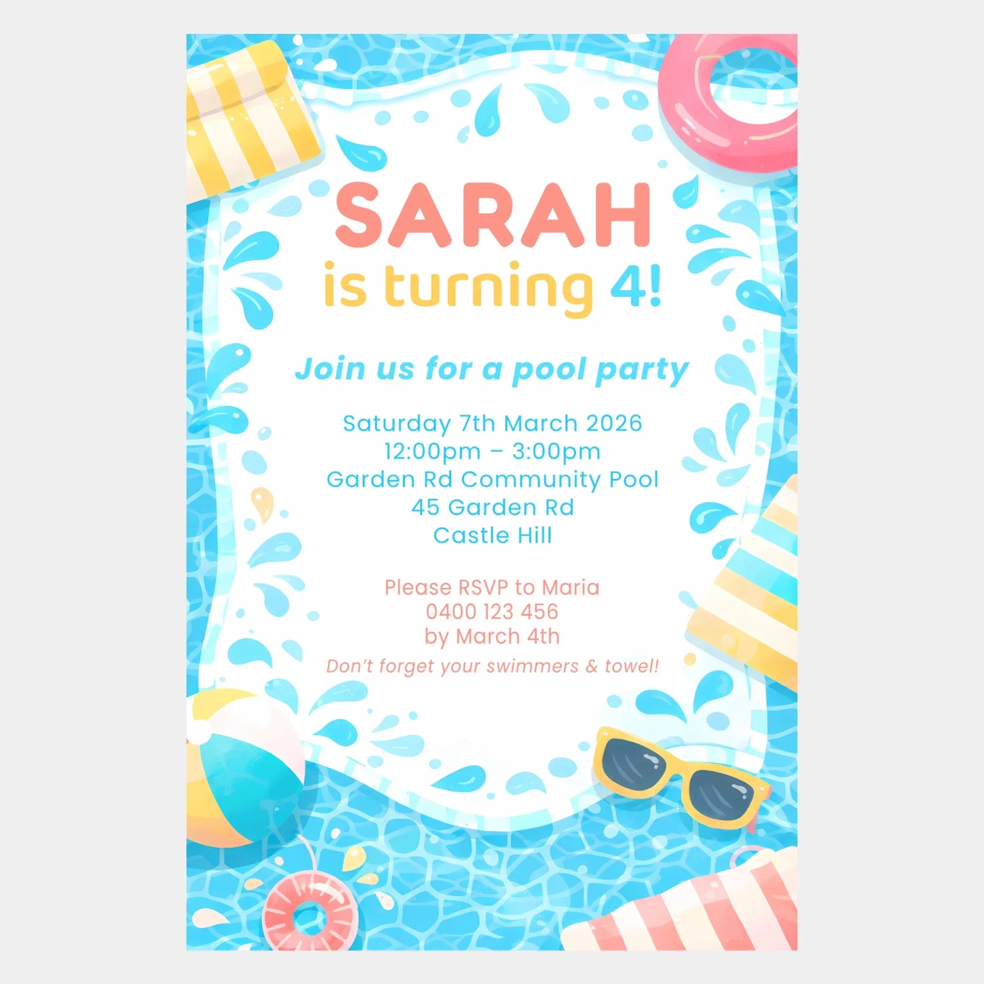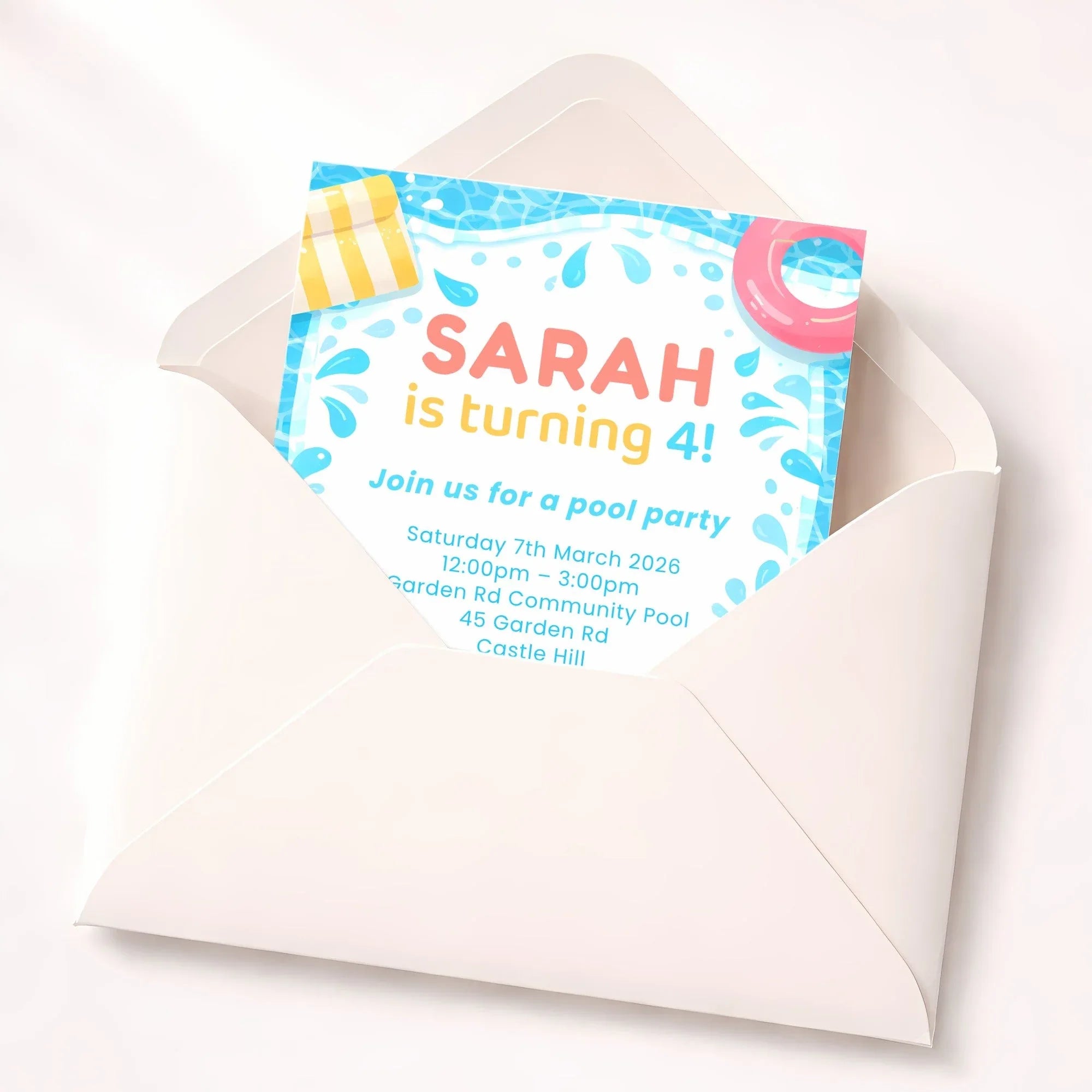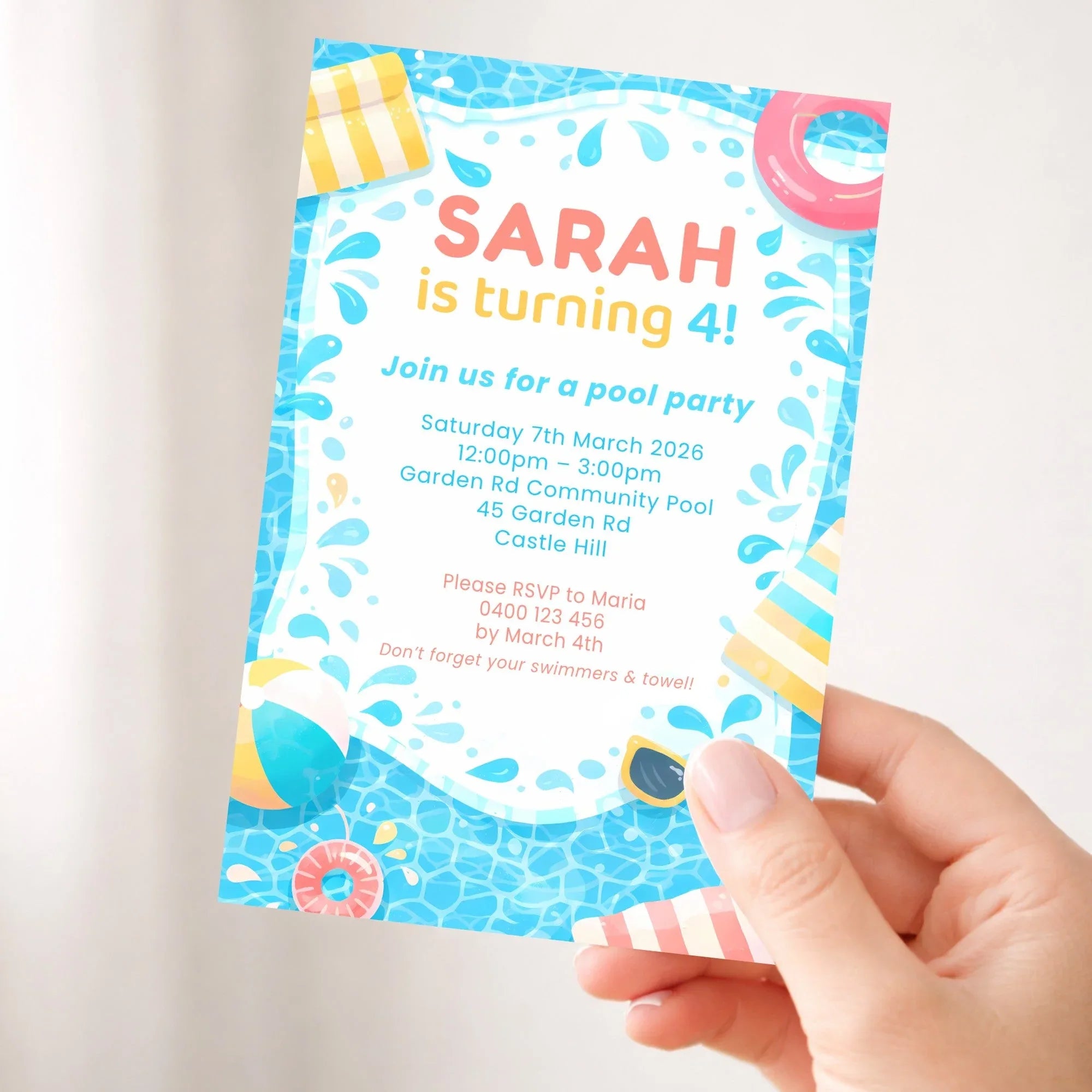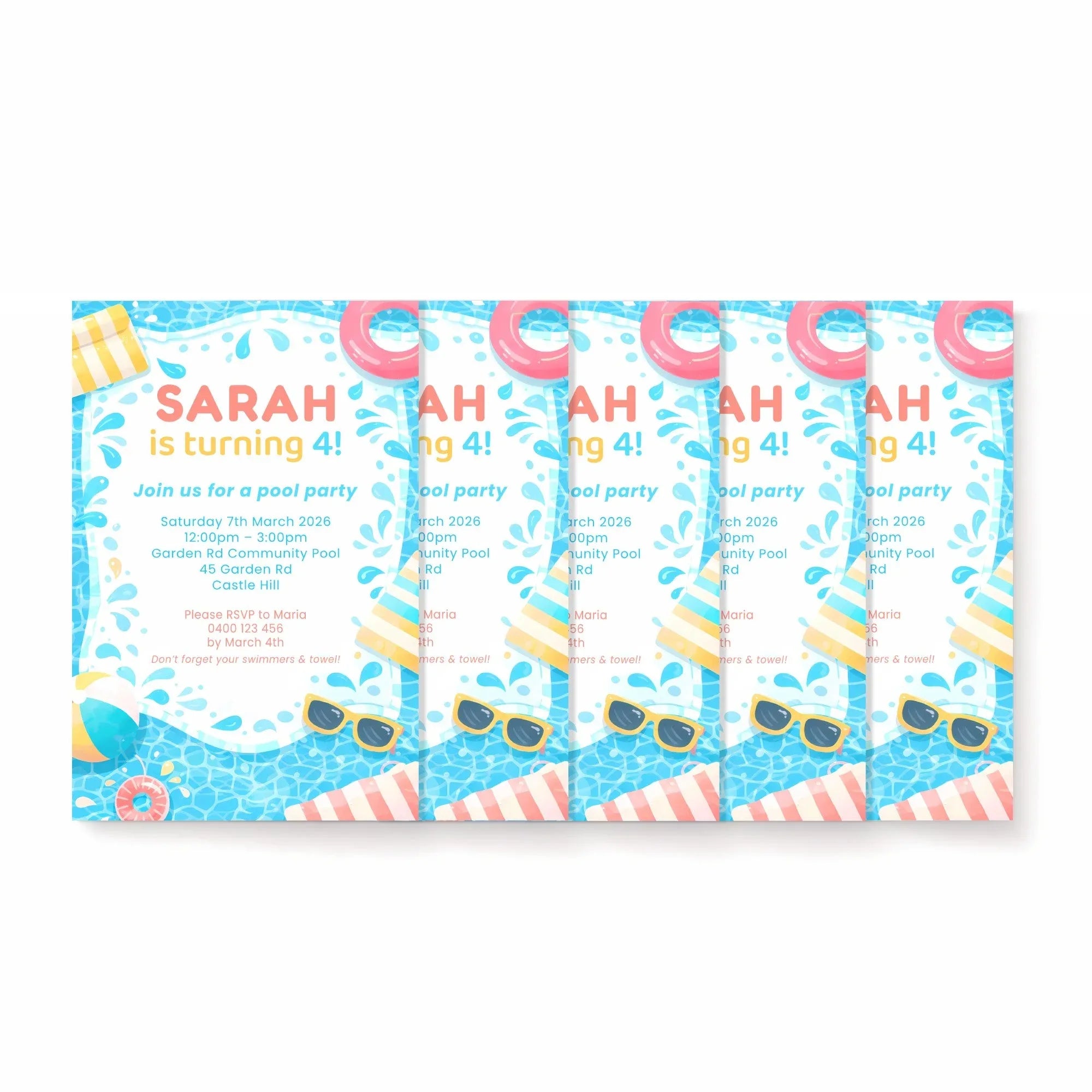 Personalised Pool Party Birthday Invitations | Kids Swimming Party Invites | Custom Printed Birthday Invitations