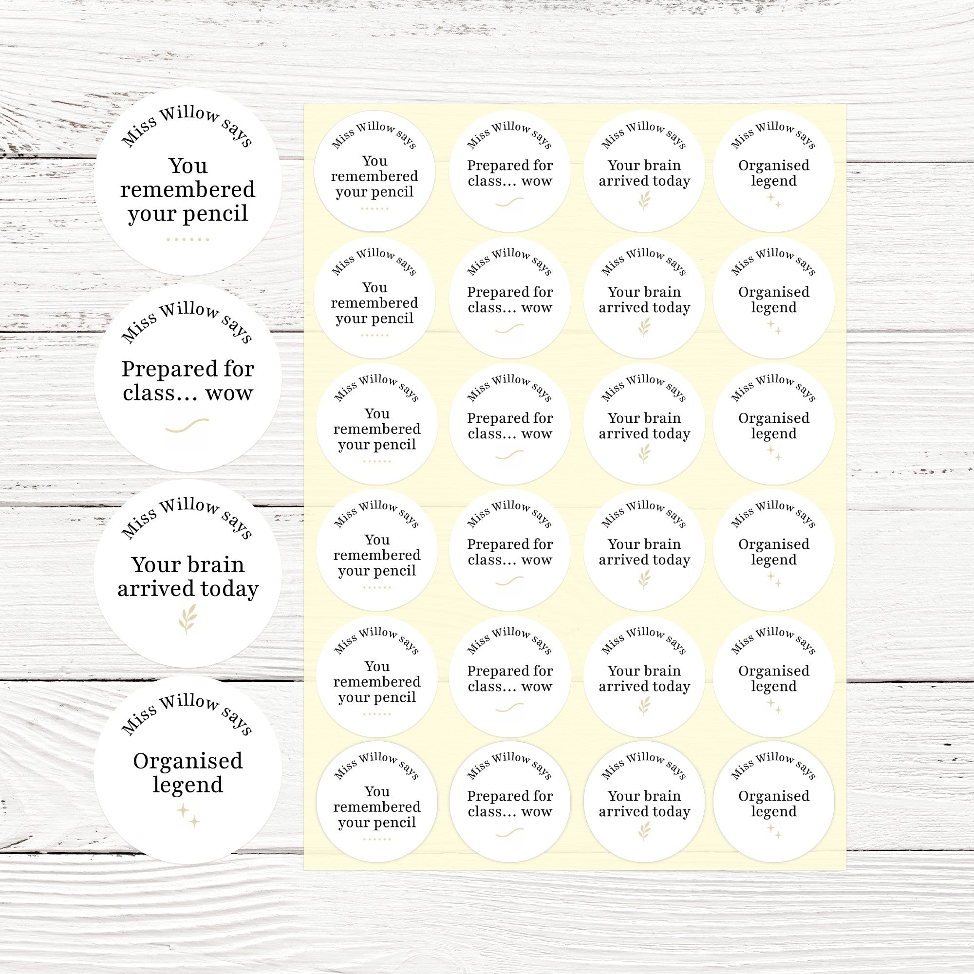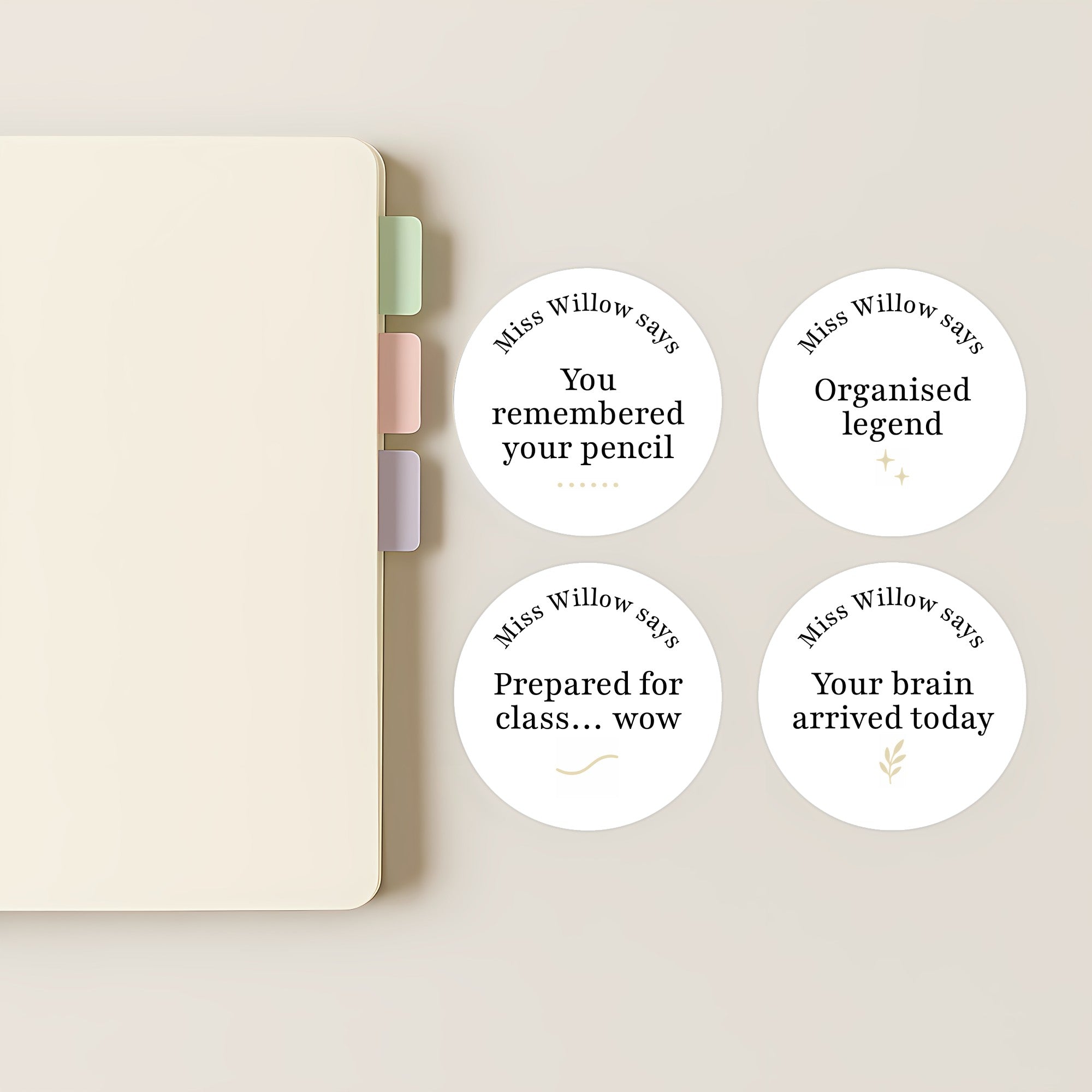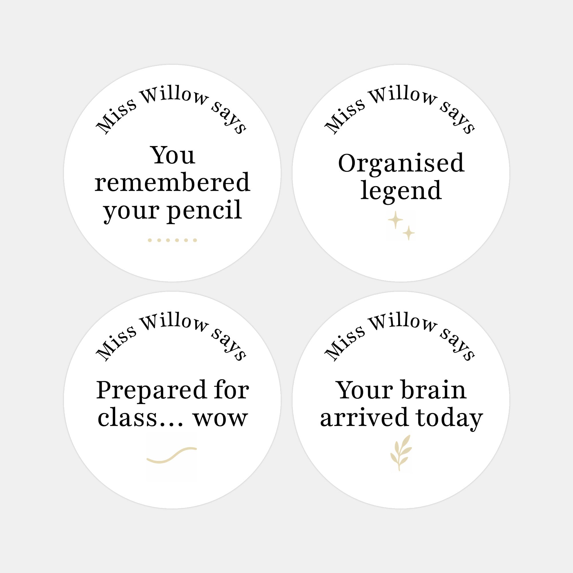 Each sticker is personalised with your name (e.g. “Miss Willow says”), keeping the design clean, modern and professional while still adding a playful twist teens genuinely respond to.