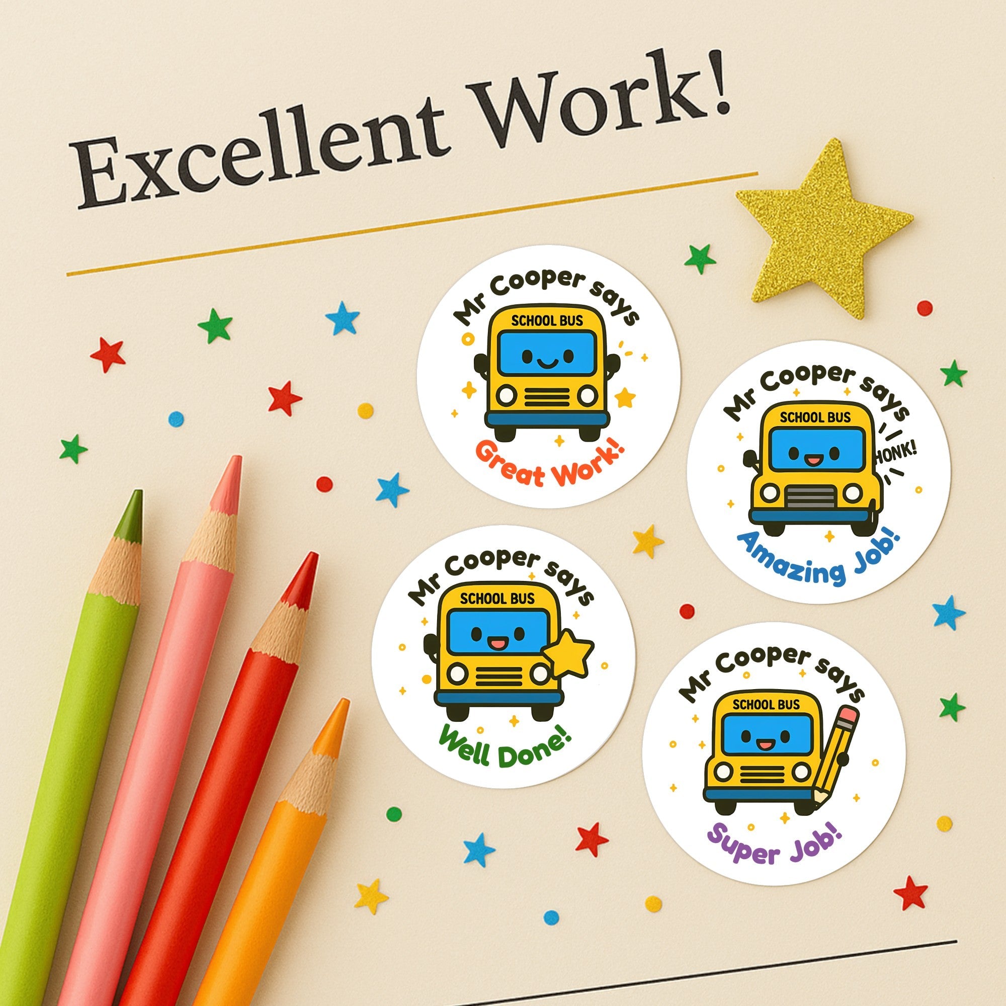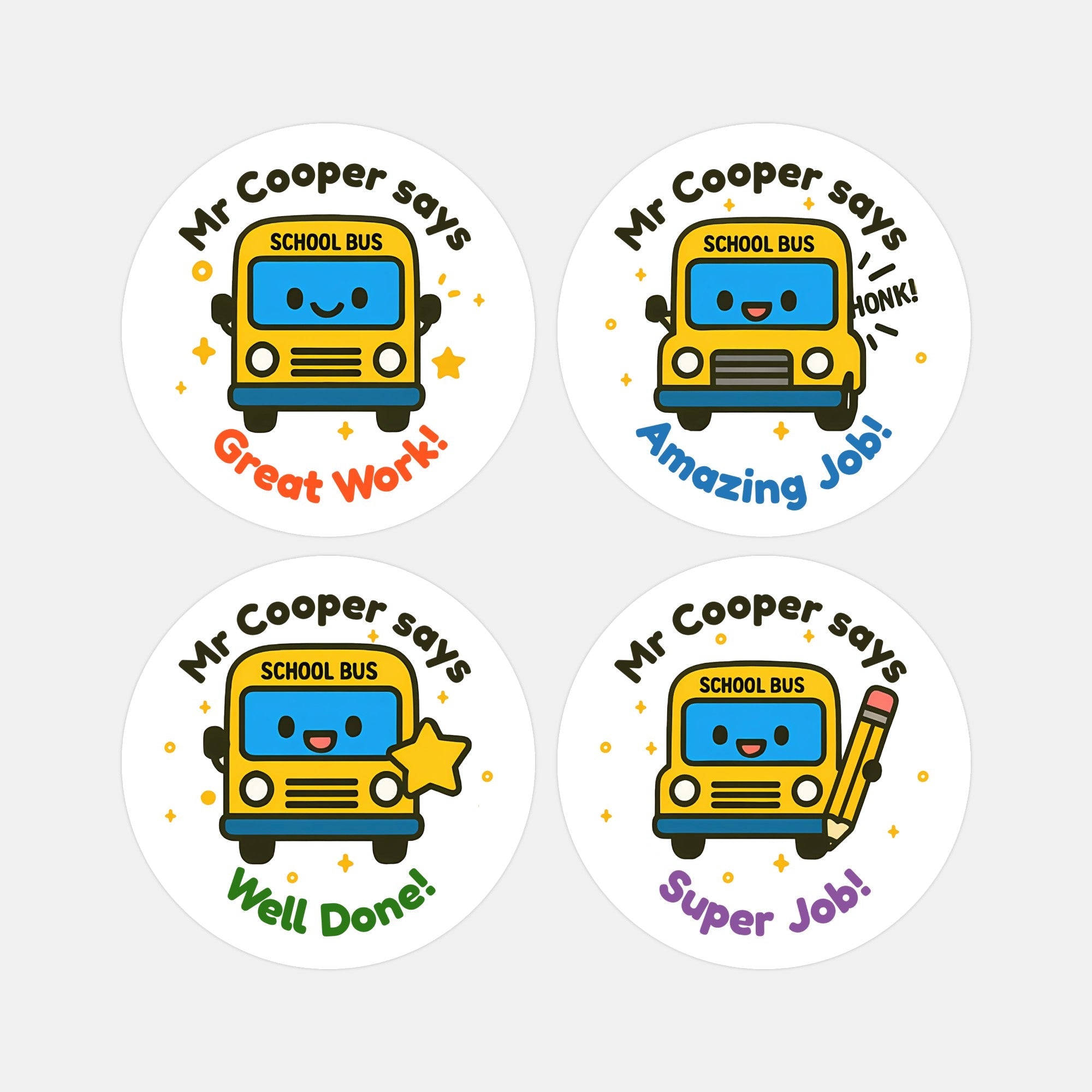 Celebrate classroom achievements with these cheerful personalised school bus teacher reward stickers! Featuring a friendly smiling school bus in bright, playful colours, each sticker includes encouraging phrases like “Great Work!”, “Amazing Job!”, “Well Done!” and “Super Job!”, perfect for motivating young learners and celebrating their progress.