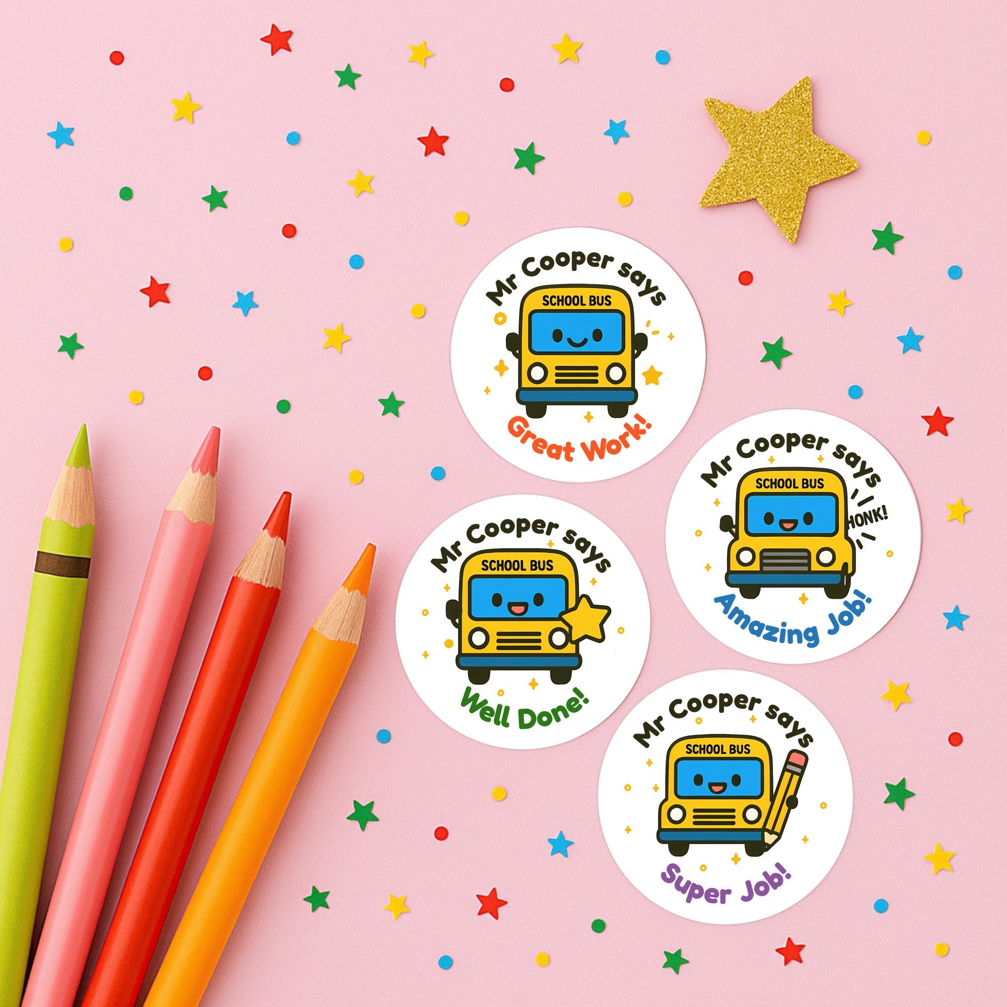 Personalised School Bus Teacher Reward Stickers – Custom Name Classroom Stickers