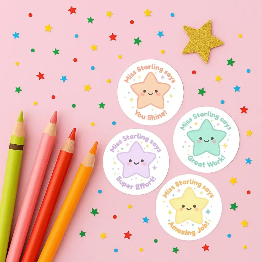 Each sticker includes your personalised name (e.g. “Miss Starling says”), adding a friendly and familiar touch that makes every reward feel extra special.
