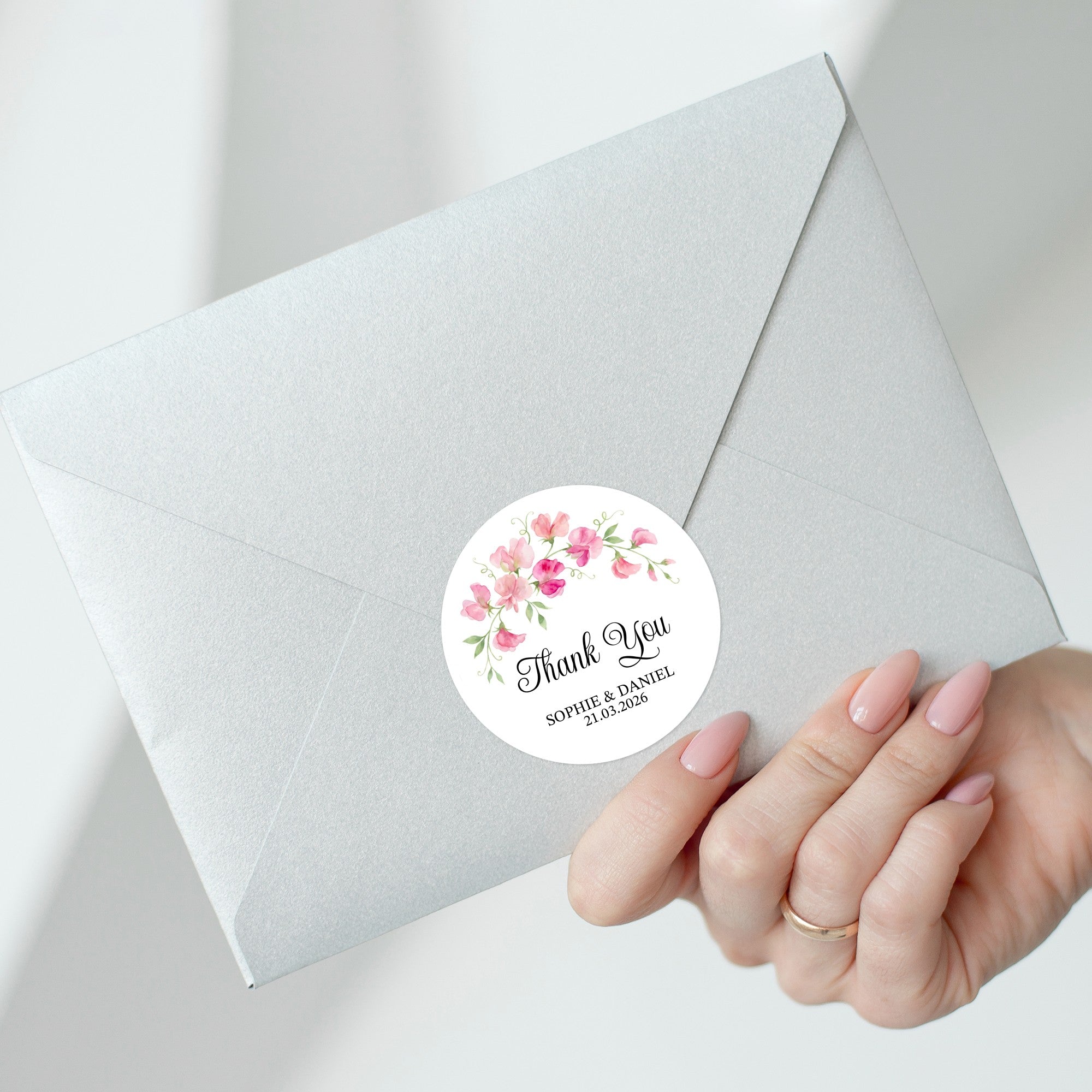 Personalised Sweet Pea Wedding Thank You Stickers | Pink Floral Favour Labels