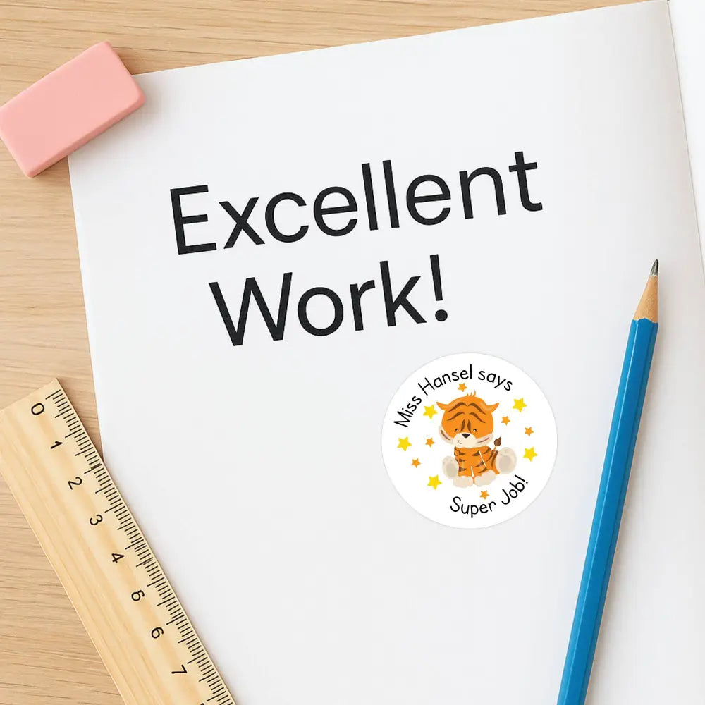 Each sticker is personalised with your name (e.g. Miss Hansel says), making them a special classroom favourite!