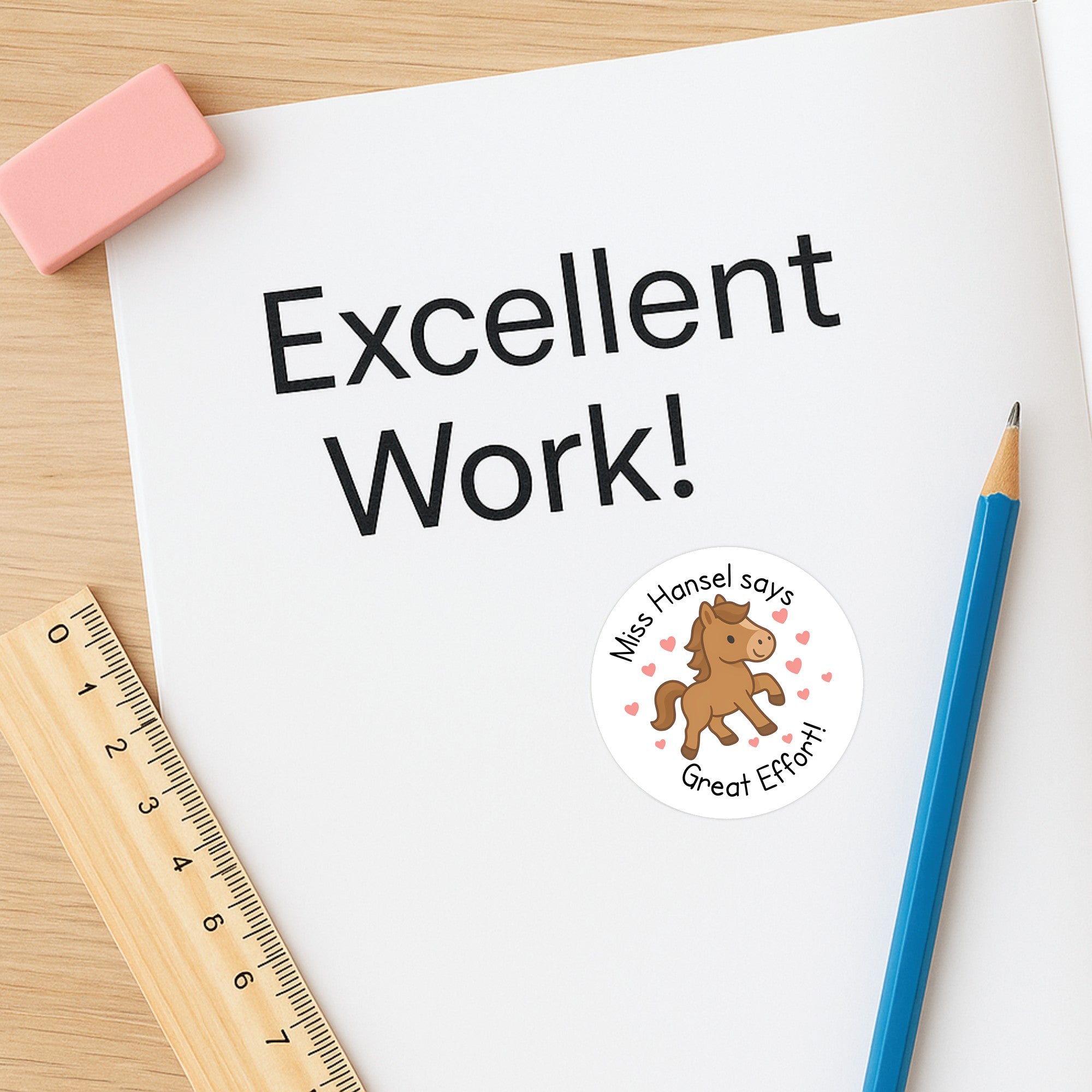 Brighten your classroom with these adorable personalised pony and horse teacher reward stickers! Each sticker features cute horse characters with sweet backgrounds and encouraging phrases like “Great Effort!”, “Lovely Work!”, “Amazing Job!” and “Brilliant Work!” — perfect for motivating young animal lovers.