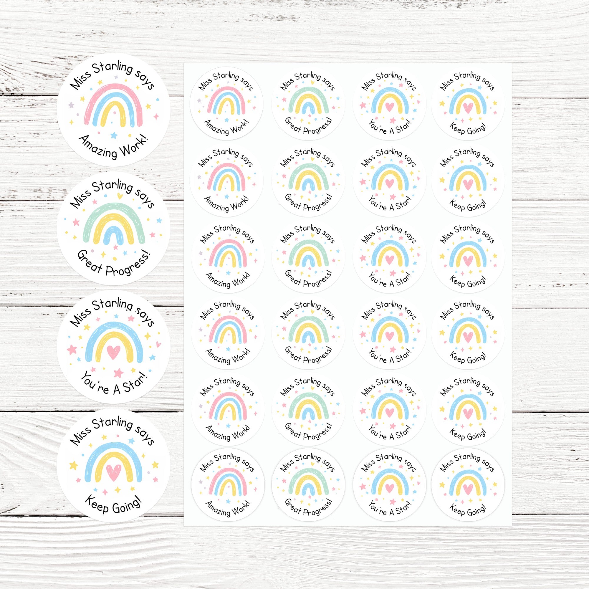 Each sticker includes your personalised name (e.g. “Miss Starling says”), creating a warm and recognisable touch children love.